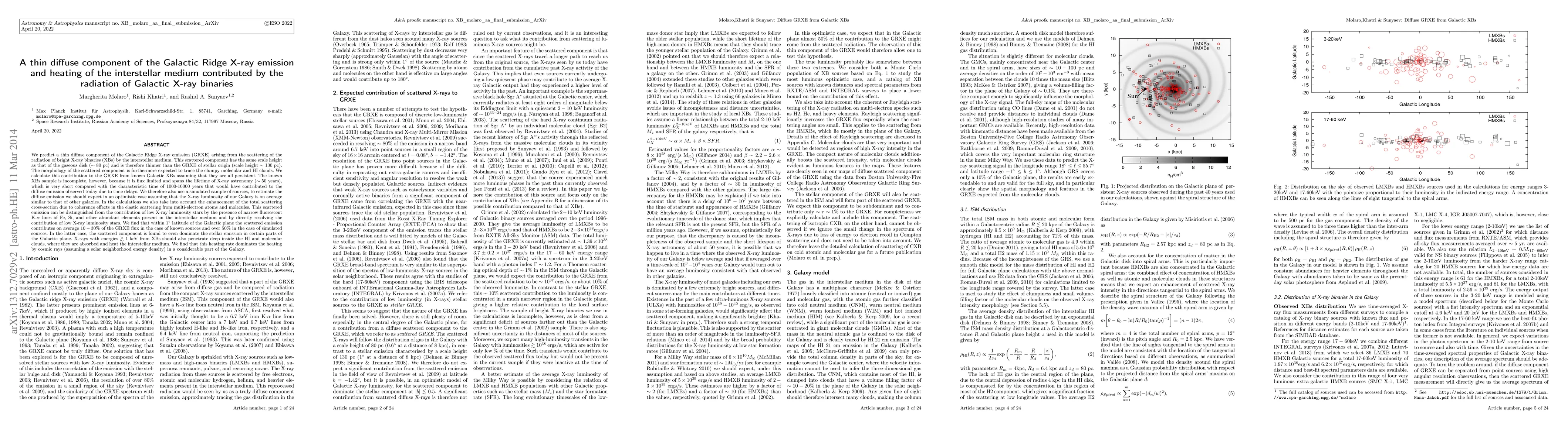 We predict a thin (scale height $\sim$ 80 pc) diffuse component of the Galactic Ridge X-ray emission (GRXE) arising from the scattering of the radiation of bright X-ray binaries (XBs) by the interstellar medium (ISM). The morphology of this scattered component is expected to trace the clumpy molecular and HI clouds. We calculate this contribution to the GRXE from known Galactic XBs assuming that they are all persistent. The known XBs sample is incomplete, however, because it is flux limited and spans the lifetime of X-ray astronomy ($\sim 50$ years). We therefore also use a simulated sample of sources, to estimate the diffuse emission we should expect in an optimistic case assuming that the X-ray luminosity of our Galaxy is on average similar to that of other galaxies. In the calculations we also take into account the enhancement of the total scattering cross-section due to coherence effects in the elastic scattering from multi-electron atoms and molecules. This scattered emission can be distinguished from the contribution of low X-ray luminosity stars by the presence of narrow fluorescent K-$\alpha$ lines of Fe, Si, and other abundant elements present in the ISM and by directly resolving the contribution of low X-ray luminosity stars. We find that within $1^\circ$ latitude of the Galactic plane the scattered emission contributes on average $10-30\%$ of the GRXE flux in the case of known sources and over $50\%$ in the case of simulated sources. In the latter case, the scattered component is found to even dominate the stellar emission in certain parts of the Galactic plane. X-rays with energies $\gtrsim 1$ keV from XBs should also penetrate deep inside the HI and molecular clouds, where they are absorbed and heat the ISM. We find that this heating rate dominates the heating by cosmic rays (assuming a solar neighborhood energy density) in a considerable part of the Galaxy. [abridged]