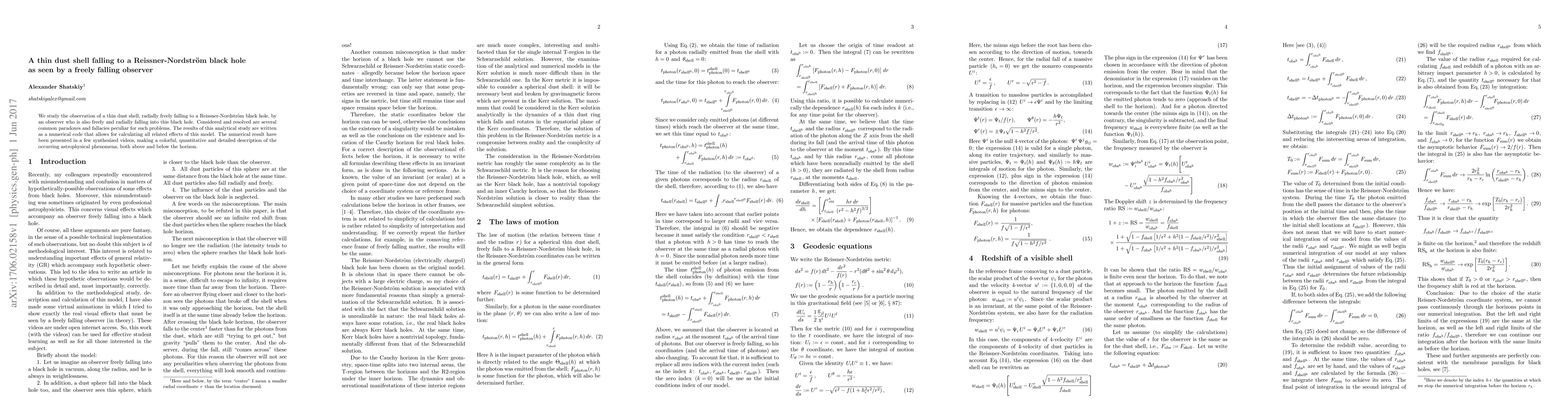 The study analytically examines the observation of a thin dust shell falling into a Reissner-Nordström black hole from the perspective of a freely falling observer, resolving common paradoxes and fallacies, and implementing the results as a numerical code for calculating related effects.