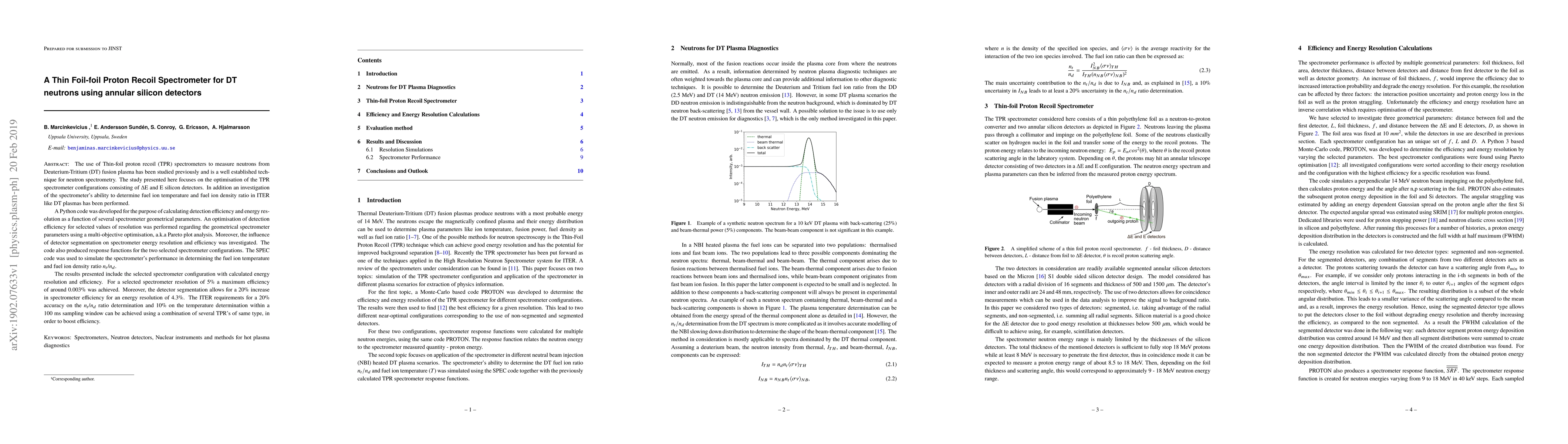 The use of Thin-foil proton recoil (TPR) spectrometers to measure neutrons from Deuterium-Tritium (DT) fusion plasma has been studied previously and is a well established technique for neutron spectrometry. The study presented here focuses on the optimisation of the TPR spectrometer configurations consisting of dE and E silicon detectors. In addition an investigation of the spectrometer's ability to determine fuel ion temperature and fuel ion density ratio in ITER like DT plasmas has been performed. A Python code was developed for the purpose of calculating detection efficiency and energy resolution as a function of several spectrometer geometrical parameters. An optimisation of detection efficiency for selected values of resolution was performed regarding the geometrical spectrometer parameters foil thickness, distance from a foil to the first detector and distance between the two detectors using a multi-objective optimisation, a.k.a Pareto plot analysis. Moreover, the influence of detector segmentation on spectrometer energy resolution and efficiency was investigated. The code also produced response functions for the two selected spectrometer configurations. The SPEC code was used to simulate the spectrometer's performance in determining the fuel ion temperature and fuel ion density ratio n_t/n_d. The results presented include the selected spectrometer configuration with calculated energy resolution and efficiency. For a selected spectrometer resolution of 5% a maximum efficiency of around 0.003% was achieved. Moreover, the detector segmentation allows for a 20% increase in spectrometer efficiency for an energy resolution of 4.3%. The ITER requirements for a 20% accuracy on the n_t/n_d ratio determination and 10% on the temperature determination within a 100ms sampling window can be achieved using a combination of several TPR's of same type, in order to boost efficiency.