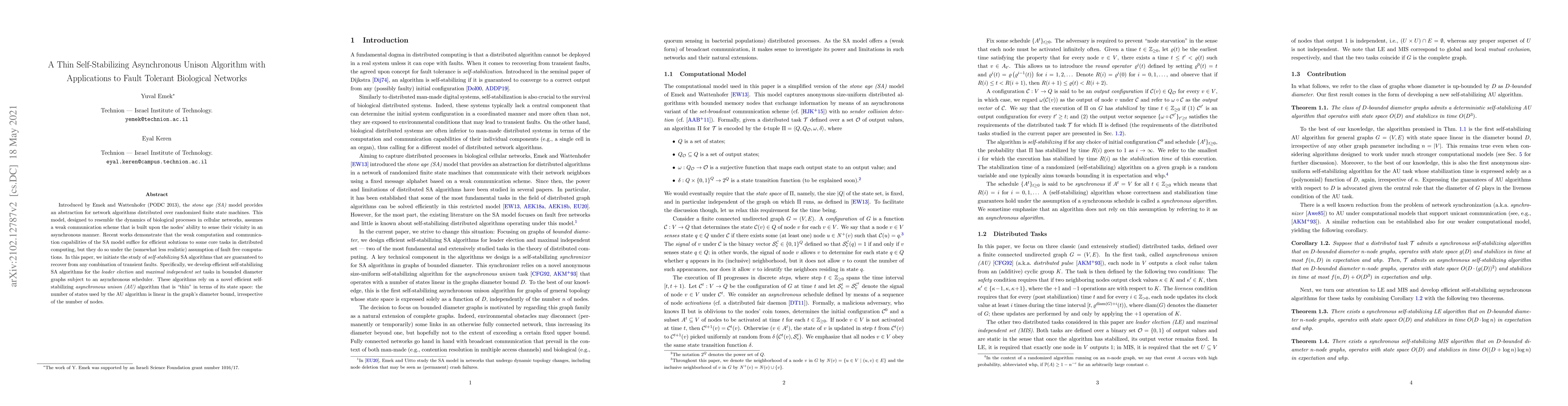 This paper develops efficient self-stabilizing algorithms for leader election and maximal independent set tasks in fault-tolerant biological networks modeled by the stone age (SA) model. It introduces a "thin" asynchronous unison (AU) algorithm that ensures recovery from transient faults, with a state space linear in the graph's diameter.