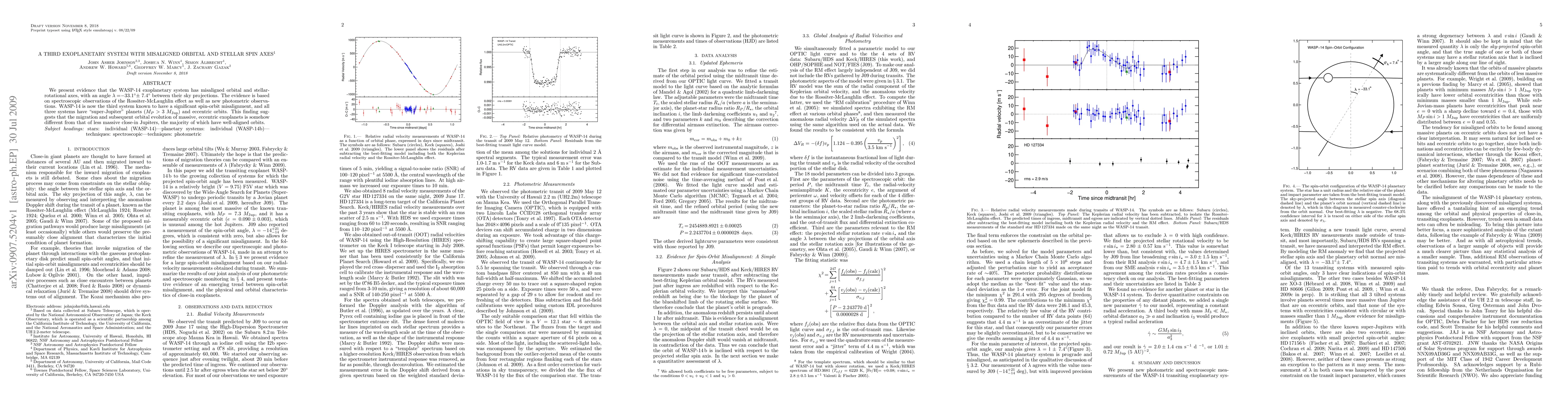 This paper reports the discovery of a misaligned spin-orbit axis in the WASP-14 exoplanetary system, marking the third such system identified. The misalignment angle is 33.1 +/- 7.4 degrees, suggesting unique migration and evolution processes for massive, eccentric exoplanets compared to typical close-in Jupiters.