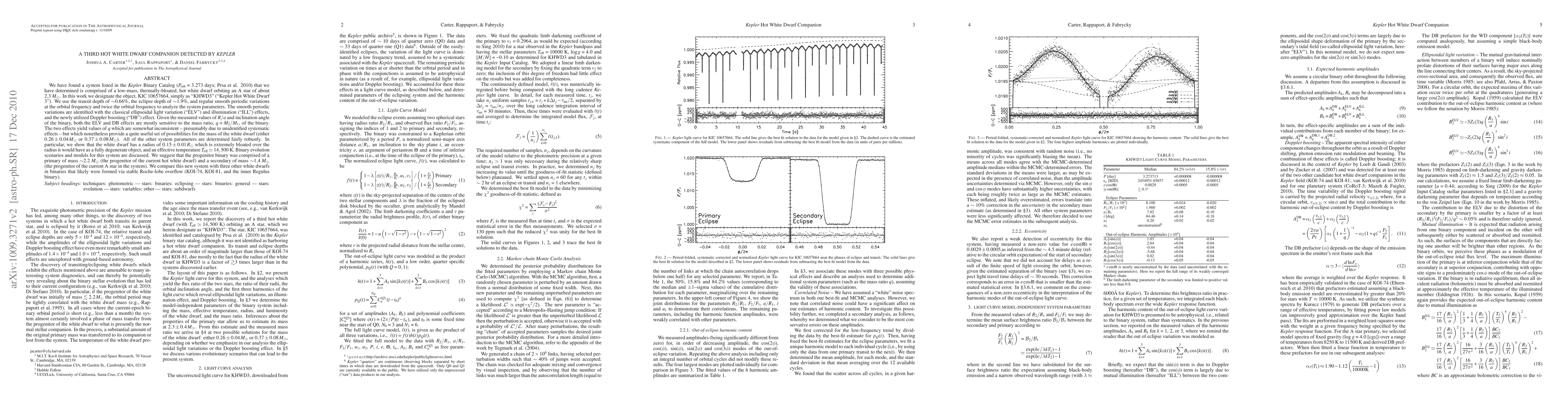 We have found a system listed in the Kepler Binary Catalog (3.273 day period; Prsa et al. 2010) that we have determined is comprised of a low-mass, thermally-bloated, hot white dwarf orbiting an A star of about 2.3 solar masses. In this work we designate the object, KIC 10657664, simply as KHWD3. We use the transit depth of ~0.66%, the eclipse depth of ~1.9%, and regular smooth periodic variations at the orbital frequency and twice the orbital frequency to analyze the system parameters. The smooth periodic variations are identified with the classical ellipsoidal light variation and illumination effects, and the newly utilized Doppler boosting effect. Given the measured values of R/a and inclination angle of the binary, both the ELV and DB effects are mostly sensitive to the mass ratio, q = M_2/M_1, of the binary. The two effects yield values of q which are somewhat inconsistent - presumably due to unidentified systematic effects - but which nonetheless provide a quite useful set of possibilities for the mass of the white dwarf (either 0.18 +/- 0.03 M_Sun or 0.37 +/- 0.08 M_Sun). All of the other system parameters are determined fairly robustly. In particular, we show that the white dwarf has a radius of 0.15 +/- 0.01 R_Sun which is extremely bloated over the radius it would have as a fully degenerate object, and an effective temperature T_eff = 14,100 +/- 350 K. Binary evolution scenarios and models for this system are discussed. We suggest that the progenitor binary was comprised of a primary of mass ~2.2 M_Sun (the progenitor of the current hot white dwarf) and a secondary of mass ~1.4 M_Sun (the progenitor of the current A star in the system). We compare this new system with three other white dwarfs in binaries that likely were formed via stable Roche-lobe overflow (KOI-74, KOI-81, and Regulus).