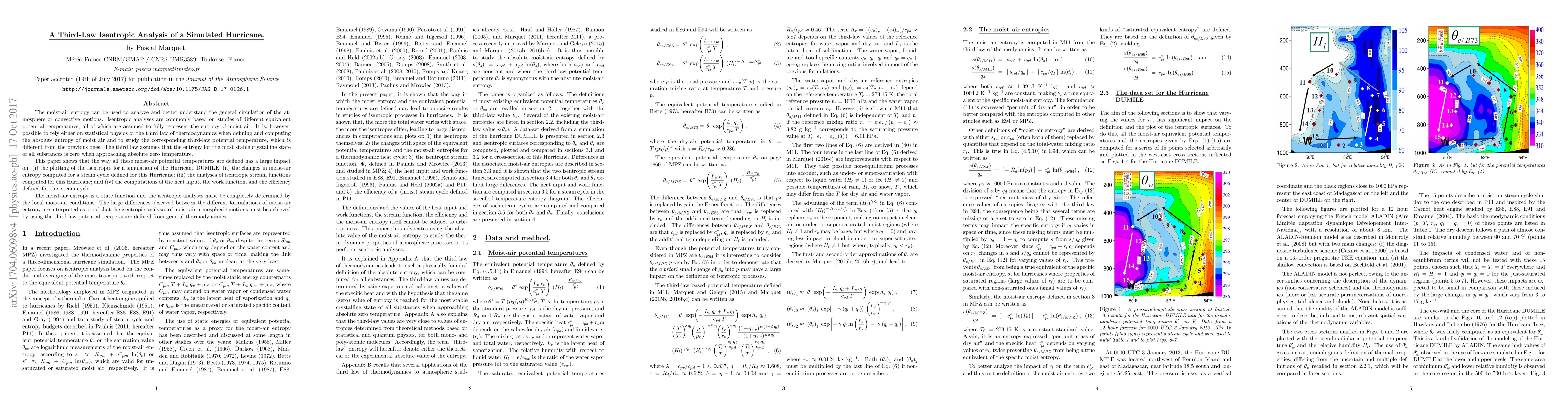 The moist-air entropy can be used to analyze and better understand the general circulation of the atmosphere or convective motions. Isentropic analyses are commonly based on studies of different equivalent potential temperatures, all of which are assumed to fully represent the entropy of moist air. It is, however, possible to rely either on statistical physics or the third law of thermodynamics when defining and computing the absolute entropy of moist air and to study the corresponding third-law potential temperature, which is different from the previous ones. The third law assumes that the entropy for the most stable crystalline state of all substances is zero when approaching absolute zero temperature. This paper shows that the way all these moist-air potential temperatures are defined has a large impact on: (i) the plotting of the isentropes for a simulation of the Hurricane DUMILE; (ii) the changes in moist-air entropy computed for a steam cycle defined for this Hurricane; (iii) the analyses of isentropic stream functions computed for this Hurricane; and (iv) the computations of the heat input, the work function, and the efficiency defined for this steam cycle. The moist-air entropy is a state function and the isentropic analyses must be completely determined by the local moist-air conditions. The large differences observed between the different formulations of moist-air entropy are interpreted as proof that the isentropic analyses of moist-air atmospheric motions must be achieved by using the third-law potential temperature defined from general thermodynamics.