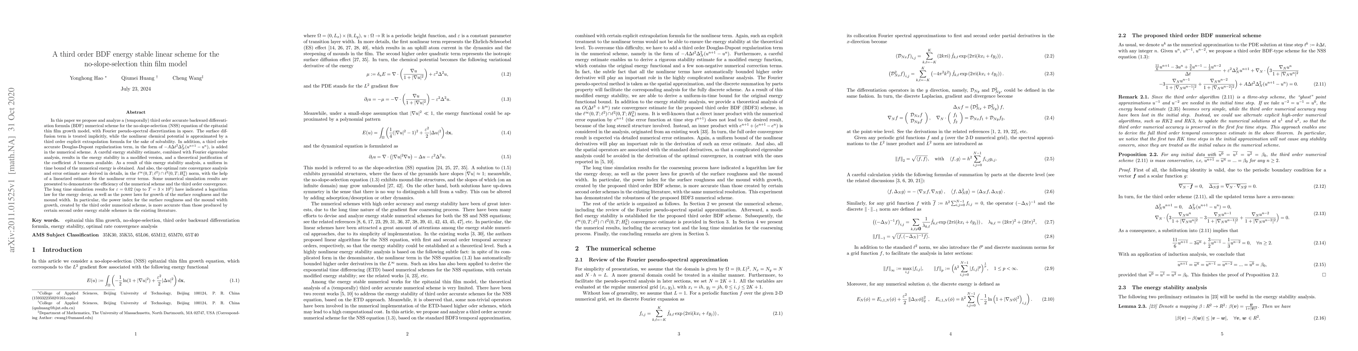 This paper proposes a third-order accurate BDF numerical scheme for the no-slope-selection thin film growth model, ensuring energy stability through a regularization term and Fourier pseudo-spectral discretization. The scheme demonstrates third-order convergence and provides more accurate long-time simulation results for surface roughness and mound width growth compared to second-order schemes.