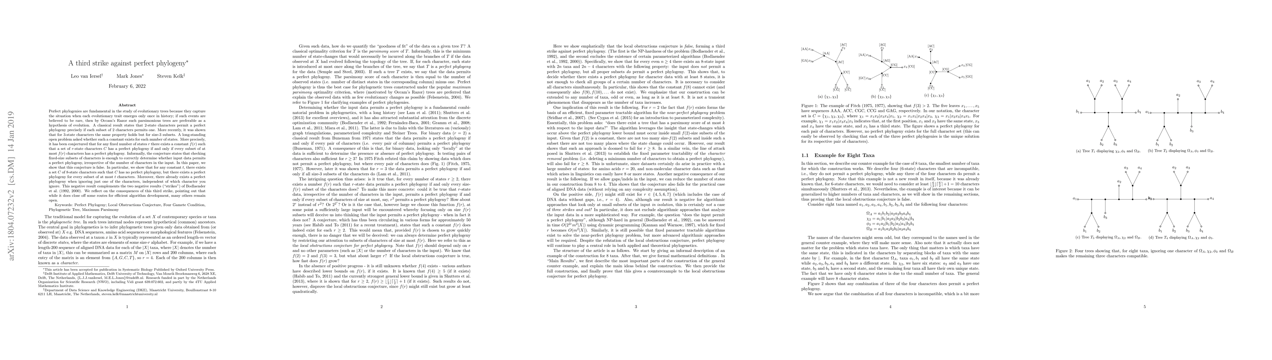 This paper refutes the conjecture that for any fixed integer $r$, there exists a constant $f(r)$ such that $r$-state characters permit a perfect phylogeny if every subset of at most $f(r)$ characters does. It demonstrates that for any constant $t$, there exists an 8-state character set without a perfect phylogeny, yet with every subset of $t$ characters admitting one, invalidating the conjecture and providing the third strike against the notion of perfect phylogenies.