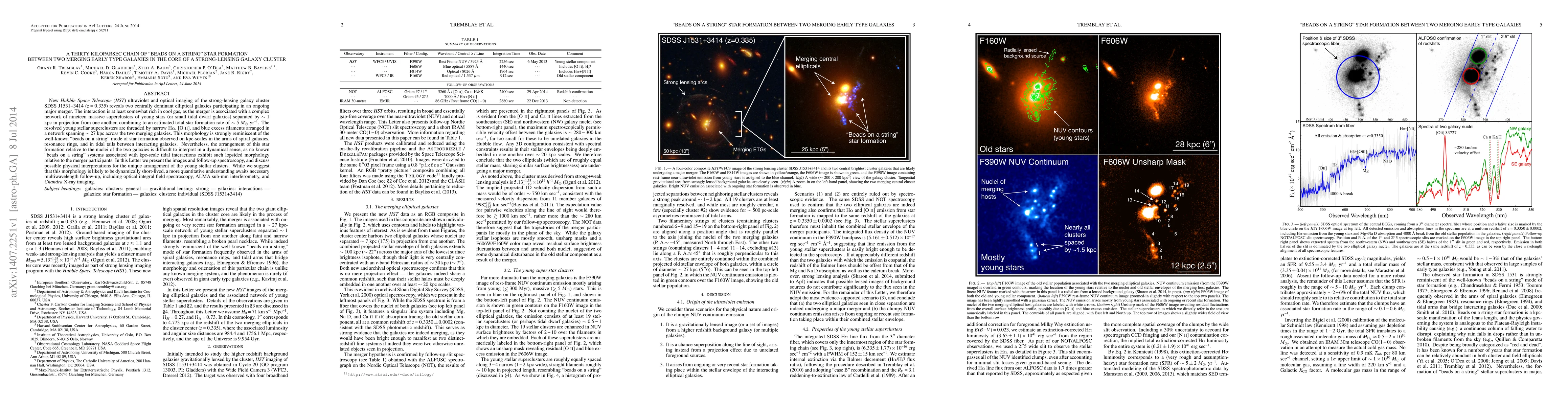 New Hubble Space Telescope imaging reveals a 30 kpc "beads on a string" star formation chain in the merger of two elliptical galaxies in the SDSS J1531+3414 cluster, featuring nineteen young stellar superclusters. The unique arrangement challenges existing models of star formation in such environments, suggesting further multiwavelength studies are needed for a comprehensive understanding.