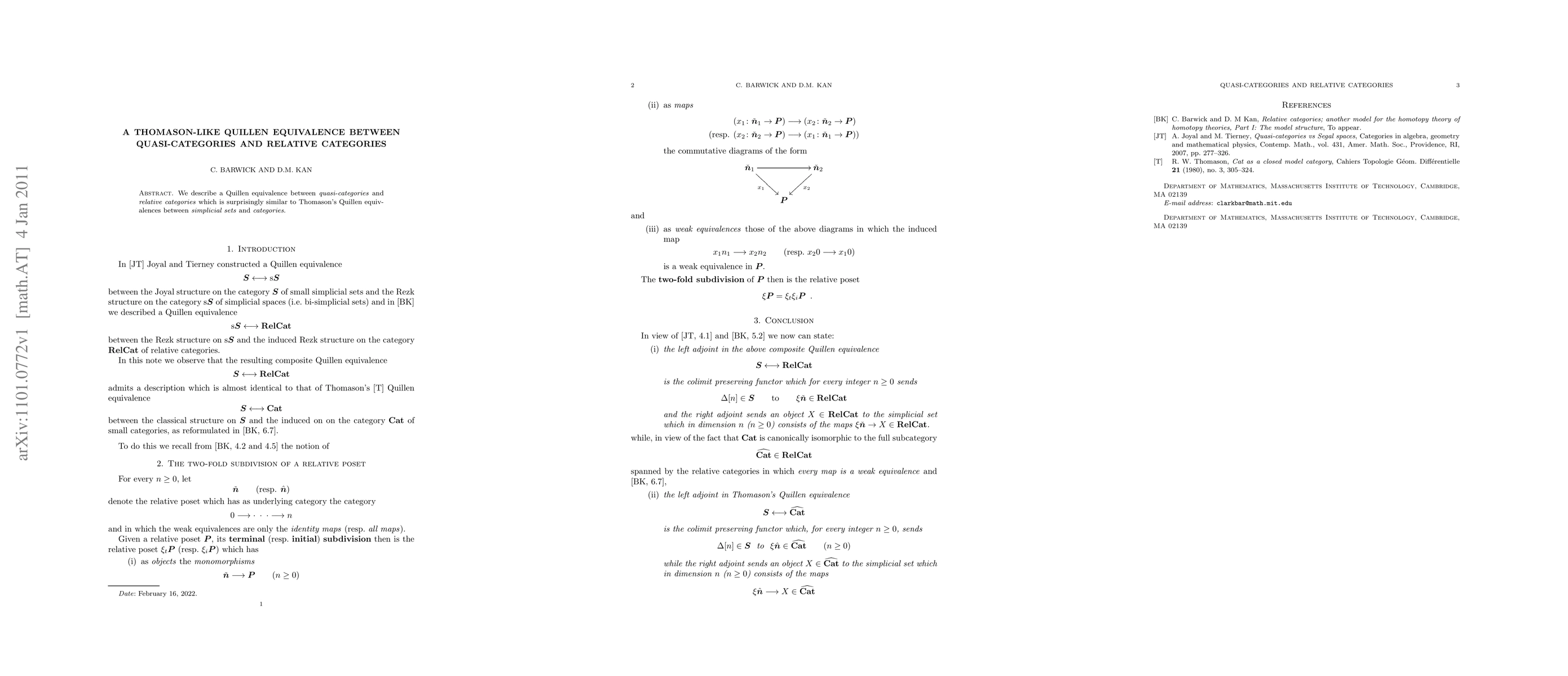 Summary: This paper establishes a Quillen equivalence between quasi-categories and relative categories, mirroring the structural similarities found in Thomason's Quillen equivalences between simplicial sets and categories. This provides a new framework for understanding the relationship between these algebraic structures.