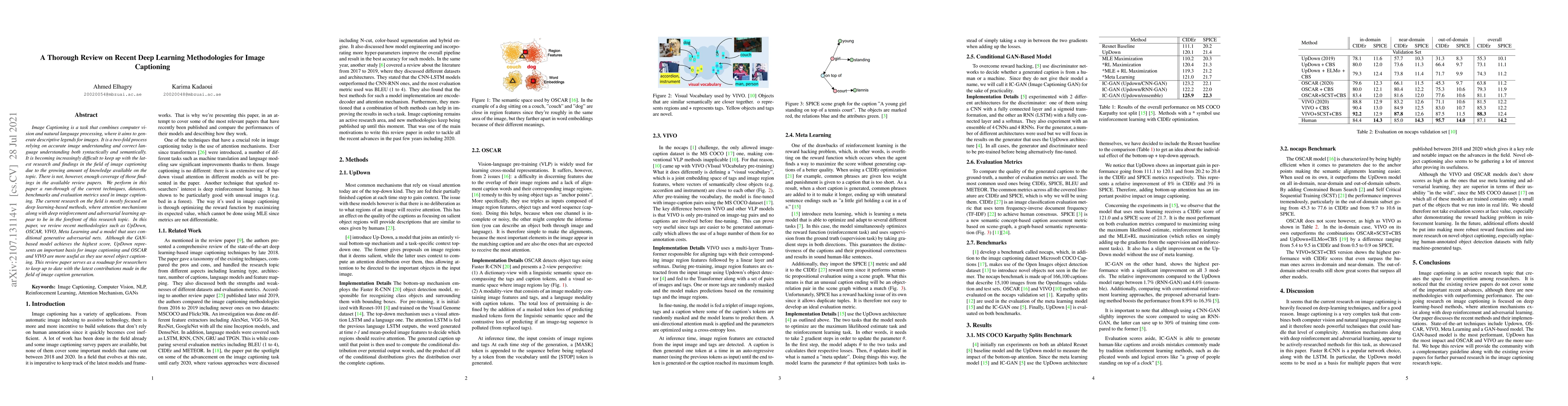 Image Captioning is a task that combines computer vision and natural language processing, where it aims to generate descriptive legends for images. It is a two-fold process relying on accurate image understanding and correct language understanding both syntactically and semantically. It is becoming increasingly difficult to keep up with the latest research and findings in the field of image captioning due to the growing amount of knowledge available on the topic. There is not, however, enough coverage of those findings in the available review papers. We perform in this paper a run-through of the current techniques, datasets, benchmarks and evaluation metrics used in image captioning. The current research on the field is mostly focused on deep learning-based methods, where attention mechanisms along with deep reinforcement and adversarial learning appear to be in the forefront of this research topic. In this paper, we review recent methodologies such as UpDown, OSCAR, VIVO, Meta Learning and a model that uses conditional generative adversarial nets. Although the GAN-based model achieves the highest score, UpDown represents an important basis for image captioning and OSCAR and VIVO are more useful as they use novel object captioning. This review paper serves as a roadmap for researchers to keep up to date with the latest contributions made in the field of image caption generation.