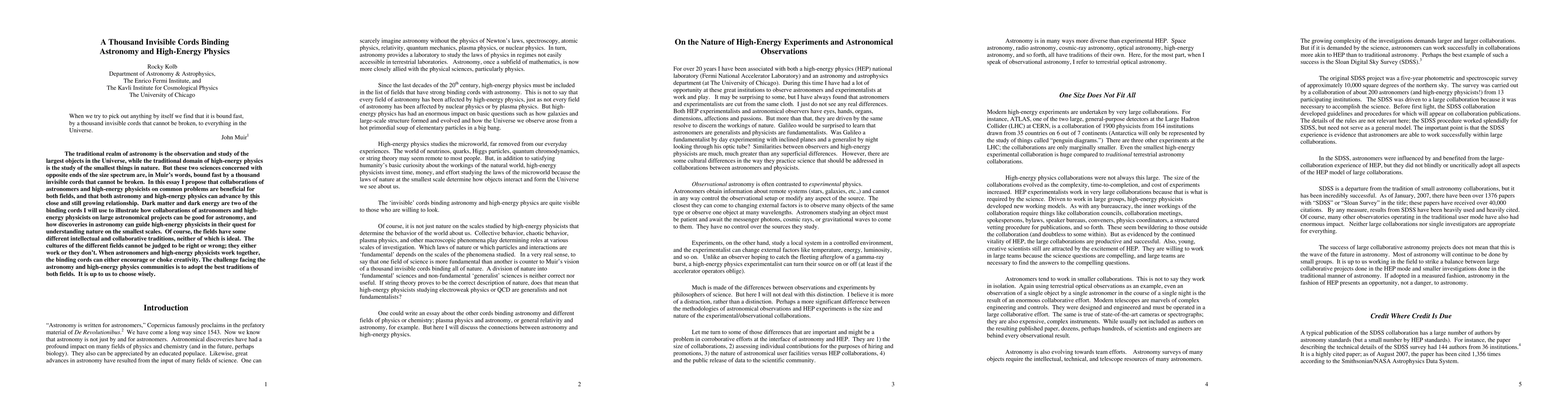 The traditional realm of astronomy is the observation and study of the largest objects in the Universe, while the traditional domain of high-energy physics is the study of the smallest things in nature. But these two sciences concerned with opposite ends of the size spectrum are, in Muir's words, bound fast by a thousand invisible cords that cannot be broken. In this essay I propose that collaborations of astronomers and high-energy physicists on common problems are beneficial for both fields, and that both astronomy and high-energy physics can advance by this close and still growing relationship. Dark matter and dark energy are two of the binding cords I will use to illustrate how collaborations of astronomers and high-energy physicists on large astronomical projects can be good for astronomy, and how discoveries in astronomy can guide high-energy physicists in their quest for understanding nature on the smallest scales. Of course, the fields have some different intellectual and collaborative traditions, neither of which is ideal. The cultures of the different fields cannot be judged to be right or wrong; they either work or they don't. When astronomers and high-energy physicists work together, the binding cords can either encourage or choke creativity. The challenge facing the astronomy and high-energy physics communities is to adopt the best traditions of both fields. It is up to us to choose wisely.