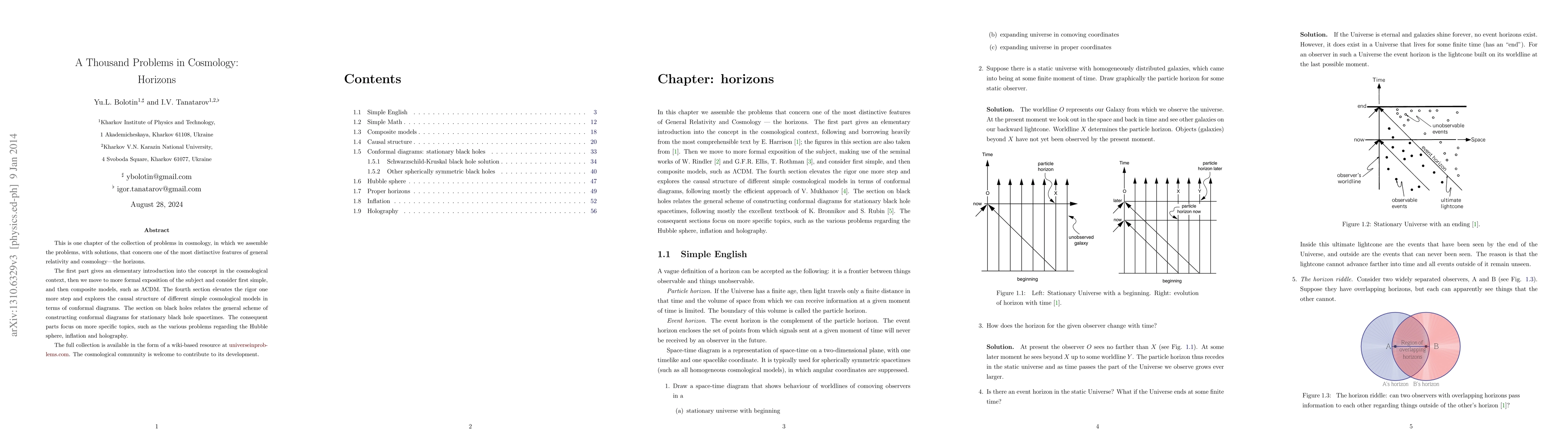 This is one chapter of the collection of problems in cosmology, in which we assemble the problems, with solutions, that concern one of the most distinctive features of general relativity and cosmology---the horizons. The first part gives an elementary introduction into the concept in the cosmological context, then we move to more formal exposition of the subject and consider first simple, and then composite models, such as $\Lambda$CDM. The fourth section elevates the rigor one more step and explores the causal structure of different simple cosmological models in terms of conformal diagrams. The section on black holes relates the general scheme of constructing conformal diagrams for stationary black hole spacetimes. The consequent parts focus on more specific topics, such as the various problems regarding the Hubble sphere, inflation and holography. The full collection is available in the form of a wiki-based resource at universeinproblems.com. The cosmological community is welcome to contribute to its development.