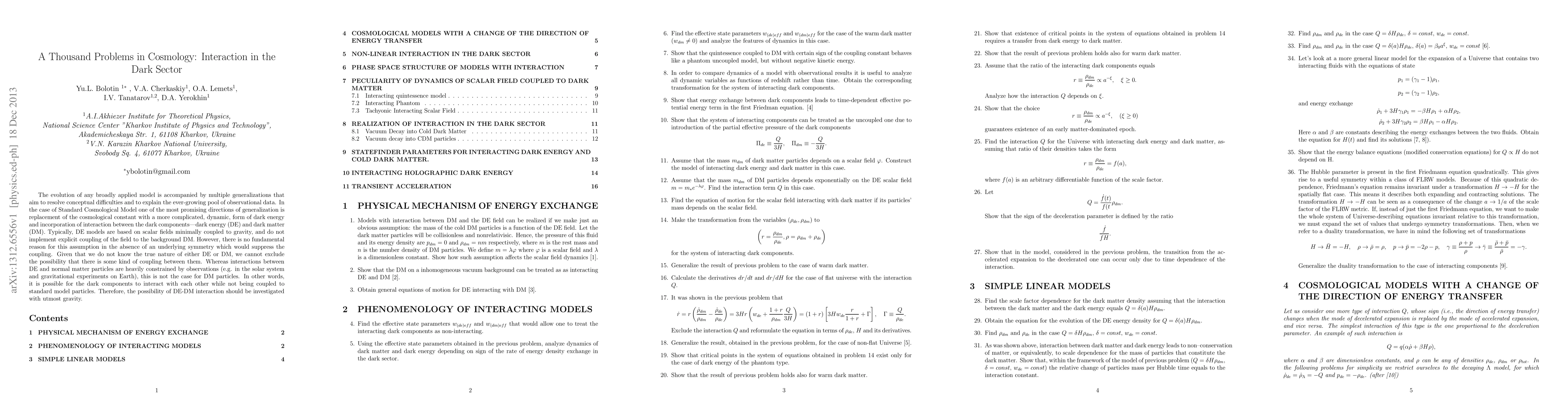 This is one chapter of the collection of problems in cosmology, in which we assemble the problems that concern one of the most distinctive features of modern cosmology---the interaction in the Dark Sector. The evolution of any broadly applied model is accompanied by multiple generalizations that aim to resolve conceptual difficulties and to explain the ever-growing pool of observational data. In the case of Standard Cosmological Model one of the most promising directions of generalization is replacement of the cosmological constant with a more complicated, dynamic, form of dark energy and incorporation of interaction between the dark components---dark energy (DE) and dark matter (DM). Typically, DE models are based on scalar fields minimally coupled to gravity, and do not implement explicit coupling of the field to the background DM. However, there is no fundamental reason for this assumption in the absence of an underlying symmetry which would suppress the coupling. Given that we do not know the true nature of either DE or DM, we cannot exclude the possibility that there is some kind of coupling between them. Whereas interactions between DE and normal matter particles are heavily constrained by observations (e.g. in the solar system and gravitational experiments on Earth), this is not the case for DM particles. In other words, it is possible for the dark components to interact with each other while not being coupled to standard model particles. Therefore, the possibility of DE-DM interaction should be investigated with utmost gravity. This version contains only formulations of 117 problems. The full collection, with solutions included, is available in the form of a wiki-based resource at universeinproblems.com. The cosmological community is welcome to contribute to its development.