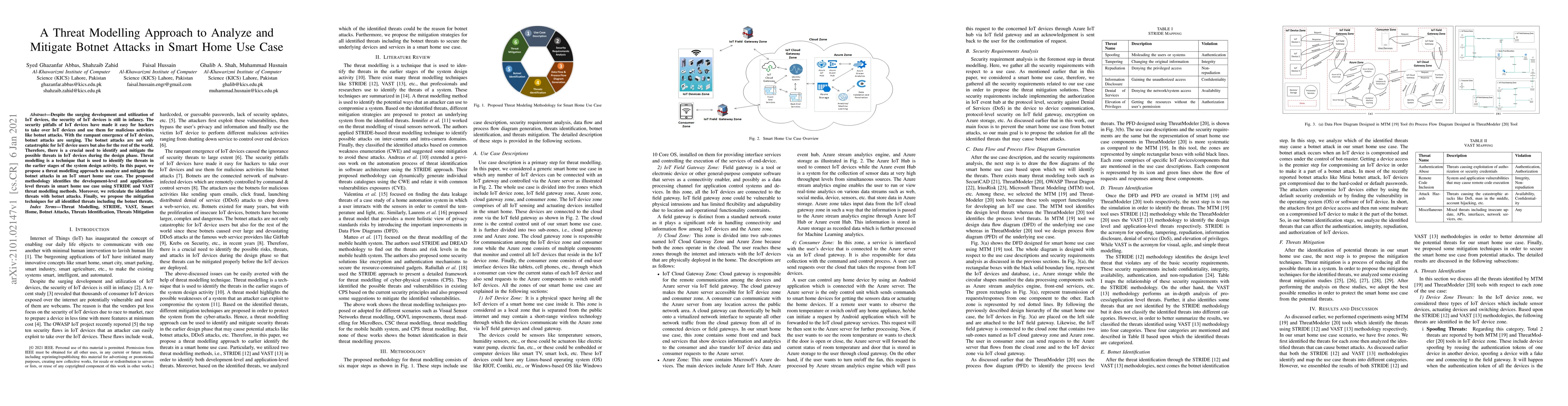 This paper proposes a threat modelling approach to identify and mitigate botnet attacks in IoT smart home devices. It uses STRIDE and VAST methods to recognize development and application-level threats, correlating them with botnet attacks, and suggests mitigation techniques for these threats.