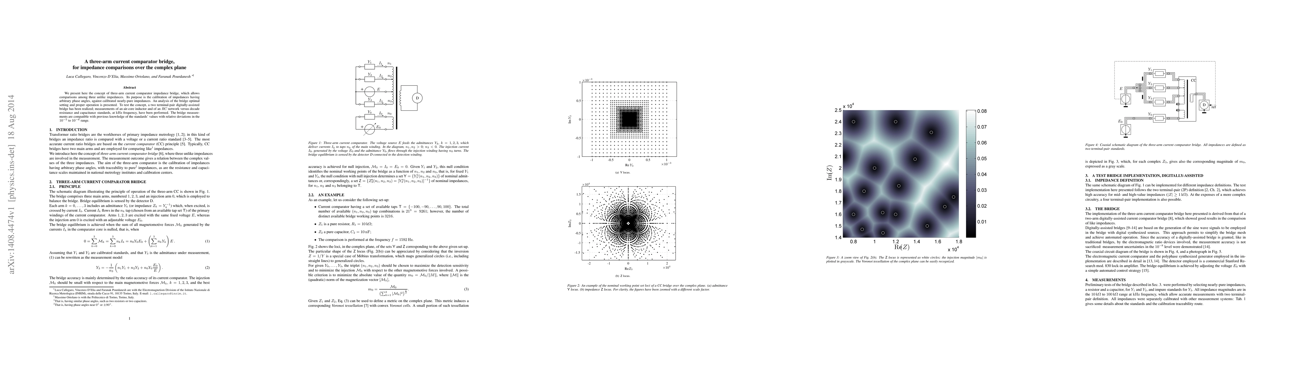 This paper introduces a three-arm current comparator bridge for comparing three different impedances, facilitating calibration of arbitrary phase angle impedances against calibrated standards. Experimental results show measurements with relative deviations in the range of 10^-5 to 10^-6, confirming the bridge's accuracy.