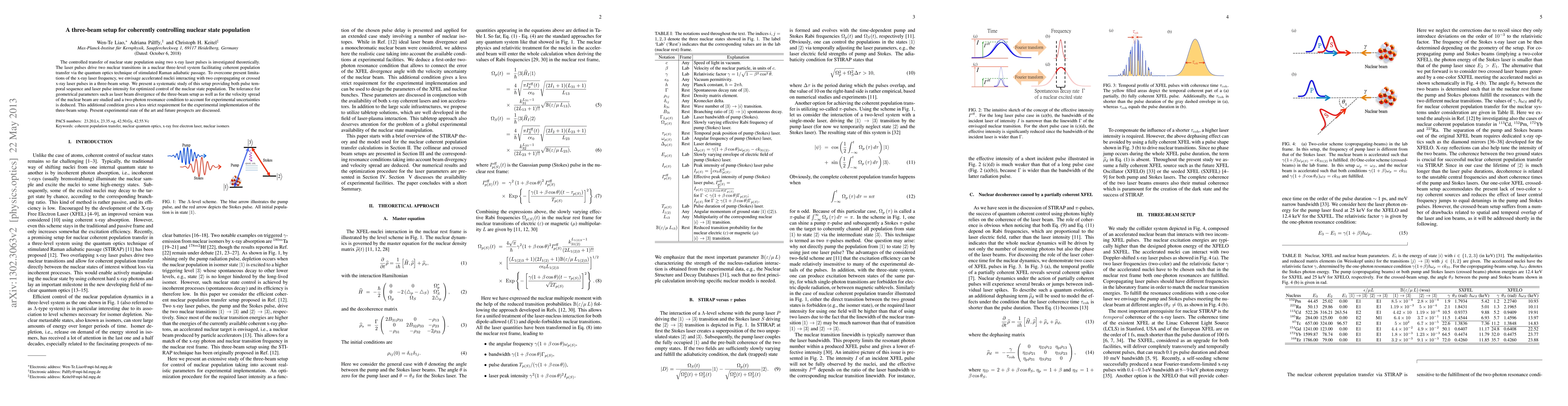 This paper investigates a three-beam setup using x-ray laser pulses to coherently control nuclear state population through stimulated Raman adiabatic passage. The study optimizes pulse sequence and intensity, assesses tolerance for geometrical parameters, and deduces a two-photon resonance condition to ease experimental implementation.