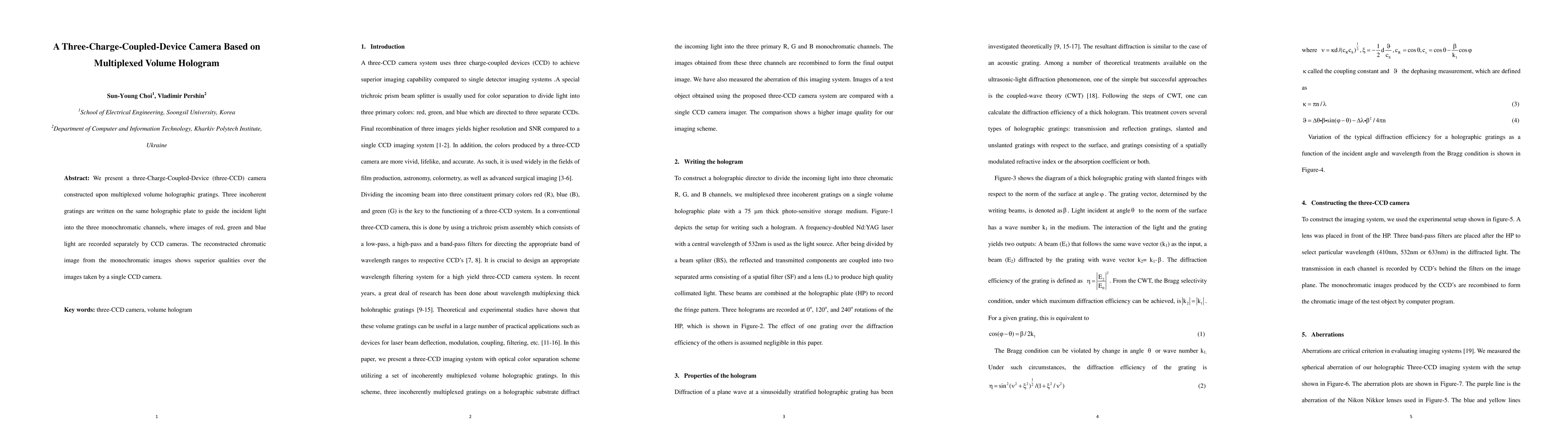 This paper introduces a three-CCD camera system utilizing multiplexed volume holographic gratings to separate red, green, and blue light channels, resulting in superior chromatic image quality compared to single CCD cameras.