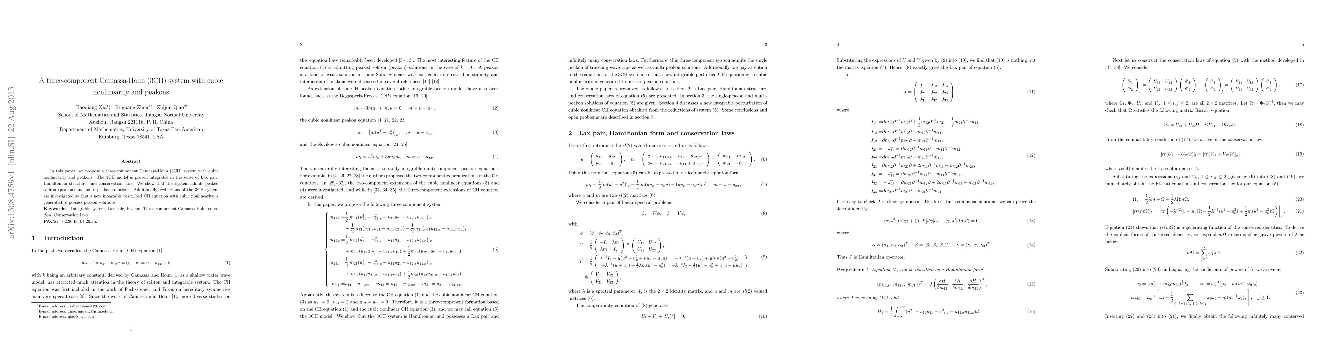 Summary: This research introduces a three-component Camassa-Holm system with cubic nonlinearity and peakons, proving its integrability through Lax pair, Hamiltonian structure, and conservation laws, and demonstrating its ability to generate peaked soliton and multi-peakon solutions. Additionally, it explores reductions leading to a new integrable perturbed equation with cubic nonlinearity and peakon solutions.