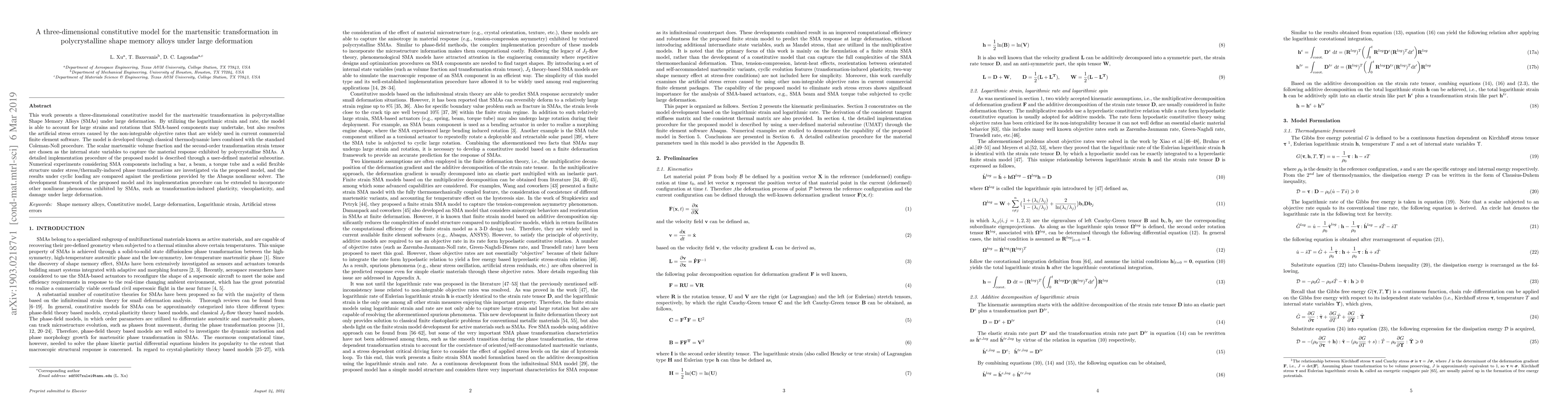 This paper introduces a three-dimensional constitutive model for martensitic transformation in polycrystalline Shape Memory Alloys under large deformation, addressing artificial stress errors and employing logarithmic strain and rate. The model, implemented via a user-defined subroutine, is validated through numerical experiments on various SMA components.