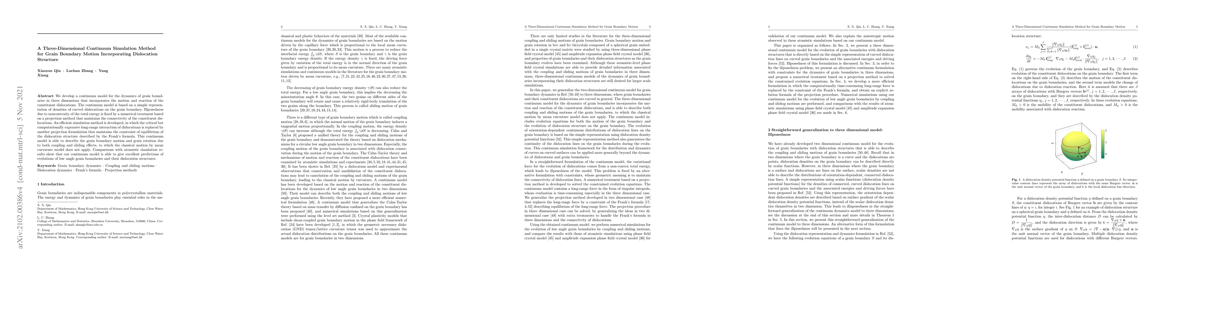 The paper presents a three-dimensional continuum model for grain boundary dynamics that integrates dislocation structures, addressing nonconvexity issues with a projection method. The efficient simulation method replaces computationally expensive long-range interactions with a projection formulation, accurately predicting low angle grain boundary evolutions and dislocation structures compared to atomistic simulations.