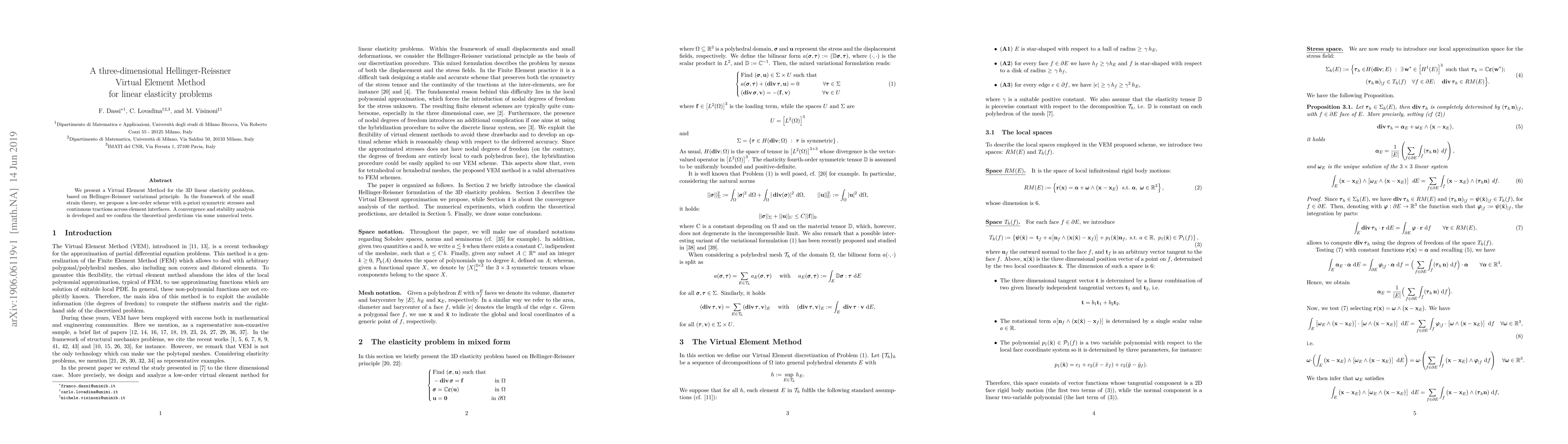 This paper presents a three-dimensional Hellinger-Reissner Virtual Element Method for solving linear elasticity problems, ensuring symmetric stresses and continuous tractions. The method is analyzed for convergence and stability, validated through numerical tests.
