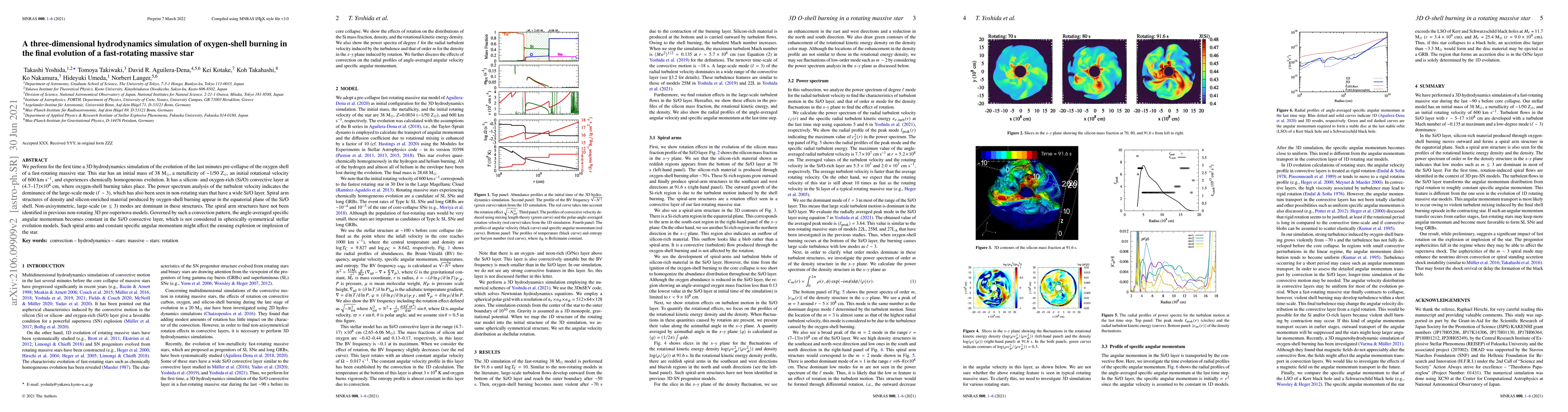 This paper presents the first 3D hydrodynamics simulation of the final evolution of a fast-rotating massive star, focusing on oxygen-shell burning. The study reveals spiral arm structures and non-axisymmetric modes in the silicon- and oxygen-rich layer, which may influence the star's subsequent explosion or implosion.