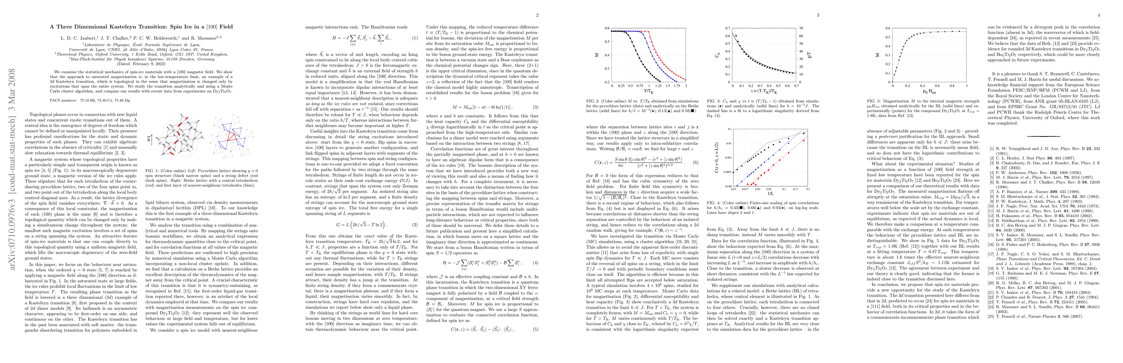 This paper investigates the statistical mechanics of spin-ice materials under a [100] magnetic field, demonstrating that the transition to saturated magnetization exemplifies a 3D Kasteleyn transition characterized by topological excitations. Analytical and Monte Carlo simulations corroborate these findings, aligning with experimental results on Dy2Ti2O7.