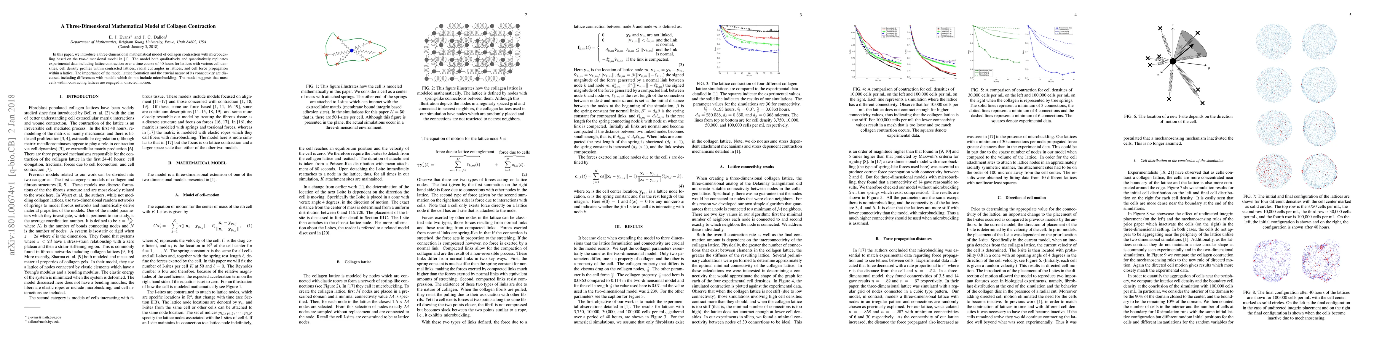 In this paper, we introduce a three-dimensional mathematical model of collagen contraction with microbuckling based on the two-dimensional model previously developed by the authors. The model both qualitatively and quantitatively replicates experimental data including lattice contraction over a time course of 40 hours for lattices with various cell densities, cell density profiles within contracted lattices, radial cut angles in lattices, and cell force propagation within a lattice. The importance of the model lattice formation and the crucial nature of its connectivity are discussed including differences with models which do not include microbuckling. The model suggests that most cells within contracting lattices are engaged in directed motion.