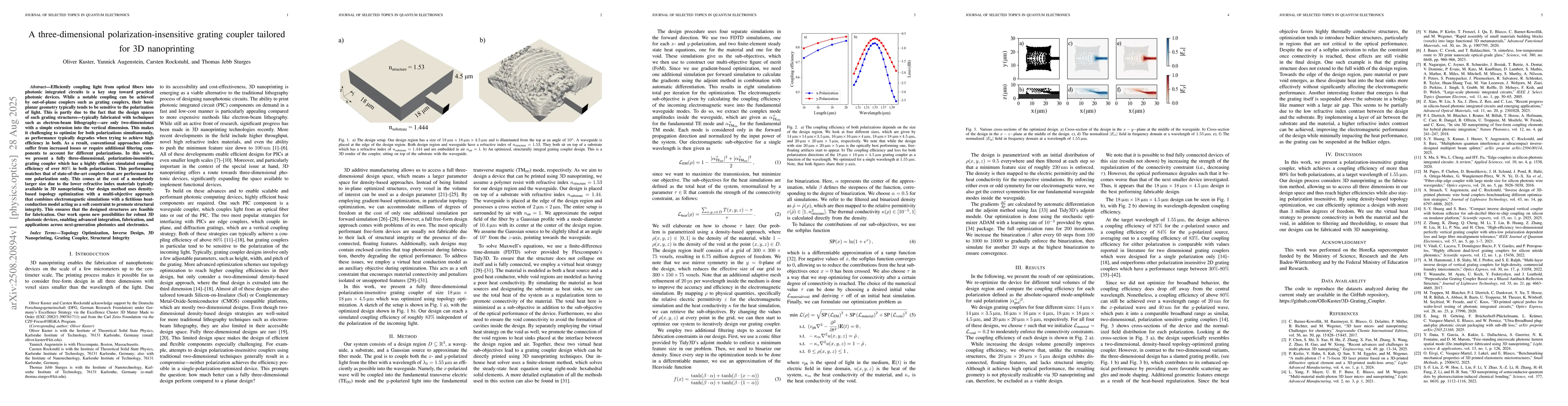 Efficiently coupling light from optical fibers into photonic integrated circuits is a key step toward practical photonic devices. While a notable coupling can be achieved by out of plane couplers such as grating couplers, their basic planar geometry typically tends to be sensitive to the polarization of light. This is partly due to the fact that the design spaces of such grating structures typically fabricated with techniques such as electron beam lithography are only two dimensional with a simple extrusion into the vertical dimension. This makes it challenging to optimize for both polarizations simultaneously, as performance typically degrades when trying to achieve high efficiency in both. As a result, conventional approaches either suffer from increased losses or require additional filtering components to account for different polarizations. In this work, we present a fully three dimensional, polarization insensitive grating coupler which has a highly efficient simulated coupling efficiency of over 80% in both polarizations. This performance matches that of state of the art couplers that are performant for one polarization only. This comes at the cost of a moderately larger size due to the lower refractive index materials typically available in 3D nanoprinting. Our design method uses density based topology optimization with a multi objective approach that combines electromagnetic simulations with a fictitious heat conduction model acting as a soft constraint to promote structural integrity. This ensures that the designed structures are feasible for fabrication. Our work opens new possibilities for robust 3D photonic devices, enabling advanced integration, fabrication, and applications across next generation photonics and electronics.