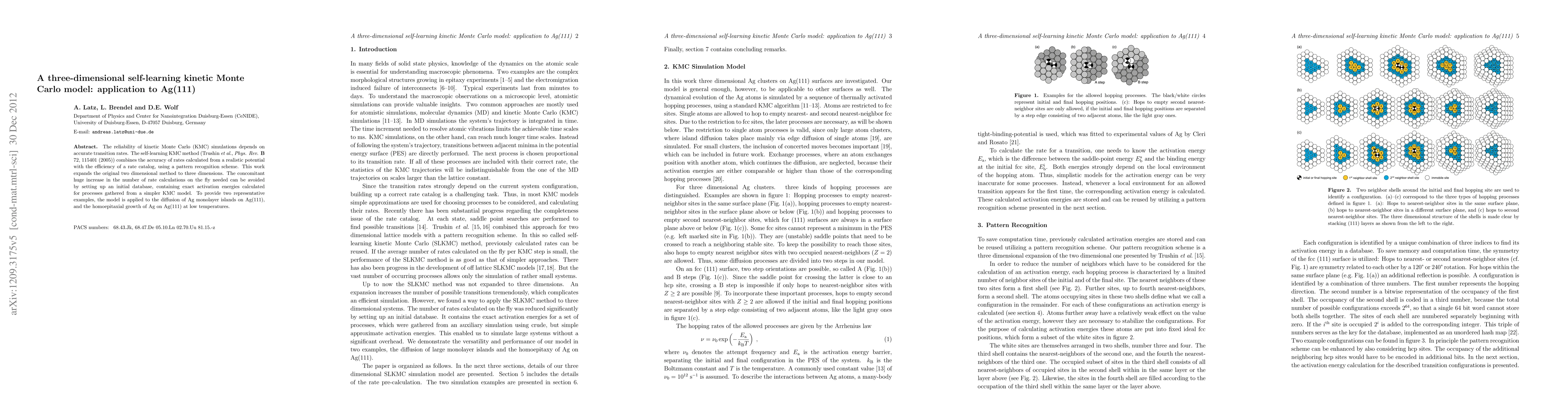 This paper introduces a three-dimensional self-learning kinetic Monte Carlo (KMC) model that enhances simulation efficiency through an initial database of exact activation energies, applied to study the diffusion of Ag islands and the homoepitaxial growth of Ag on Ag(111) surfaces. The method merges accurate transition rates with an efficient rate catalog using pattern recognition.