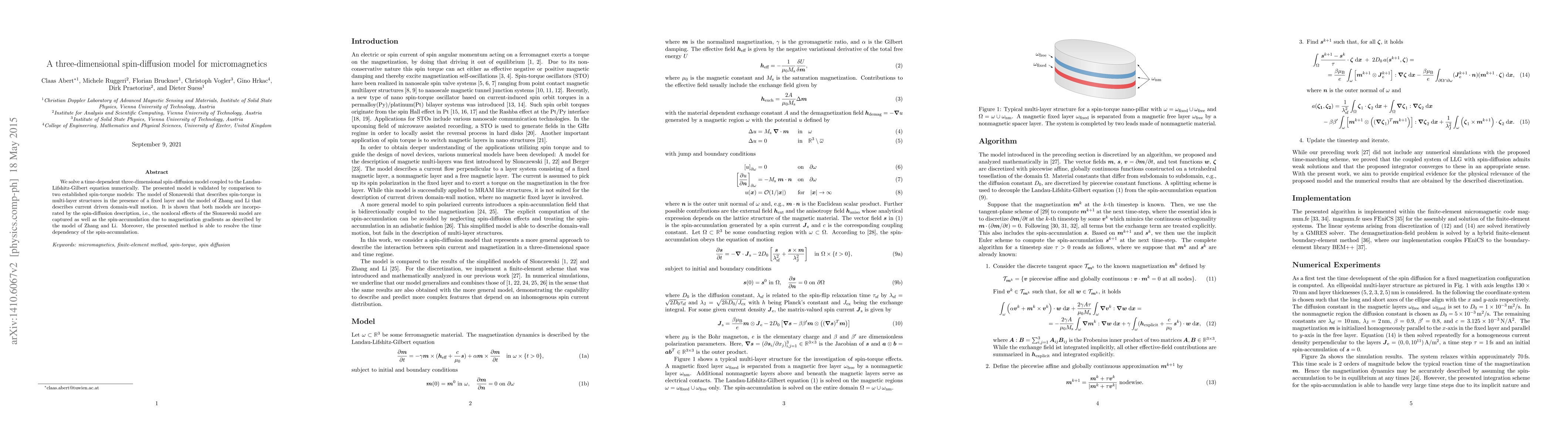 We implement a finite-element scheme that solves the Landau-Lifshitz-Gilbert equation coupled to a diffusion equation accounting for spin-polarized currents. The latter solves for the spin accumulation not only in magnetic materials but also in nonmagnetic conductors. The presented method incorporates the model by Slonczewski for the description of spin torque in magnetic multilayers as well as the model of Zhang and Li for the description of current driven domain-wall motion. Furthermore it is able to do both resolve the time evolution of the spin accumulation or treat it in an adiabatic fashion by the choice of sufficiently large time steps.