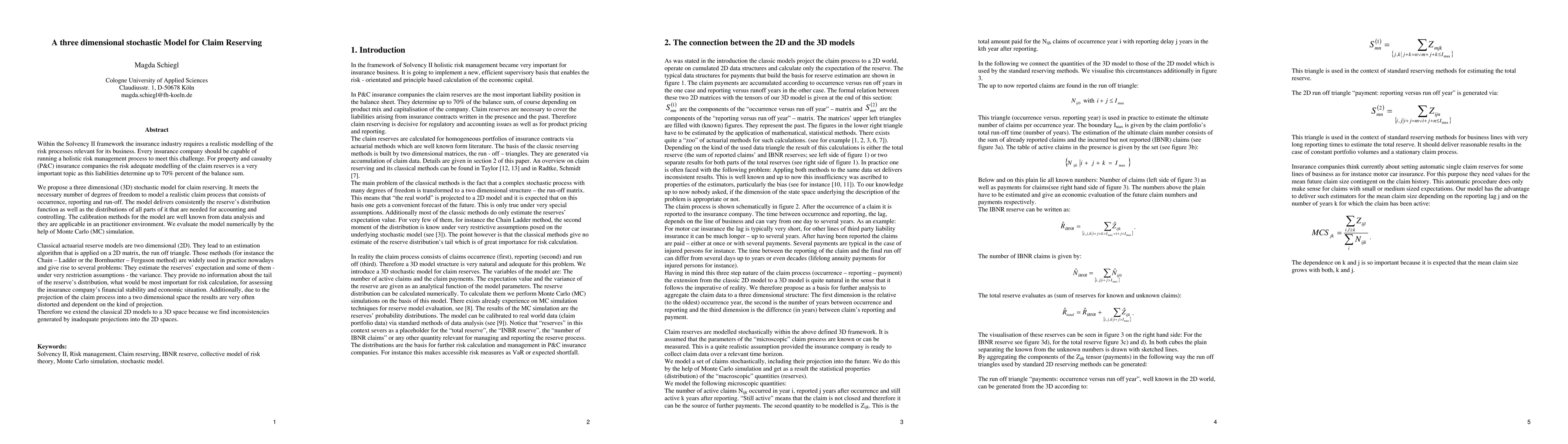 Within the Solvency II framework the insurance industry requires a realistic modelling of the risk processes relevant for its business. Every insurance company should be capable of running a holistic risk management process to meet this challenge. For property and casualty (P&C) insurance companies the risk adequate modelling of the claim reserves is a very important topic as this liabilities determine up to 70% percent of the balance sum. We propose a three dimensional (3D) stochastic model for claim reserving. It delivers consistently the reserve's distribution function as well as the distributions of all parts of it that are needed for accounting and controlling. The calibration methods for the model are well known from data analysis and they are applicable in an practitioner environment. We evaluate the model numerically by the help of Monte Carlo (MC) simulation. Classical actuarial reserve models are two dimensional (2D). They lead to an estimation algorithm that is applied on a 2D matrix, the run off triangle. Those methods (for instance the Chain - Ladder or the Bornhuetter - Ferguson method) are widely used in practice nowadays and give rise to several problems: They estimate the reserves' expectation and some of them - under very restriction assumptions - the variance. They provide no information about the tail of the reserve's distribution, what would be most important for risk calculation, for assessing the insurance company's financial stability and economic situation. Additionally, due to the projection of the claim process into a two dimensional space the results are very often distorted and dependent on the kind of projection. Therefore we extend the classical 2D models to a 3D space because we find inconsistencies generated by inadequate projections into the 2D spaces.
