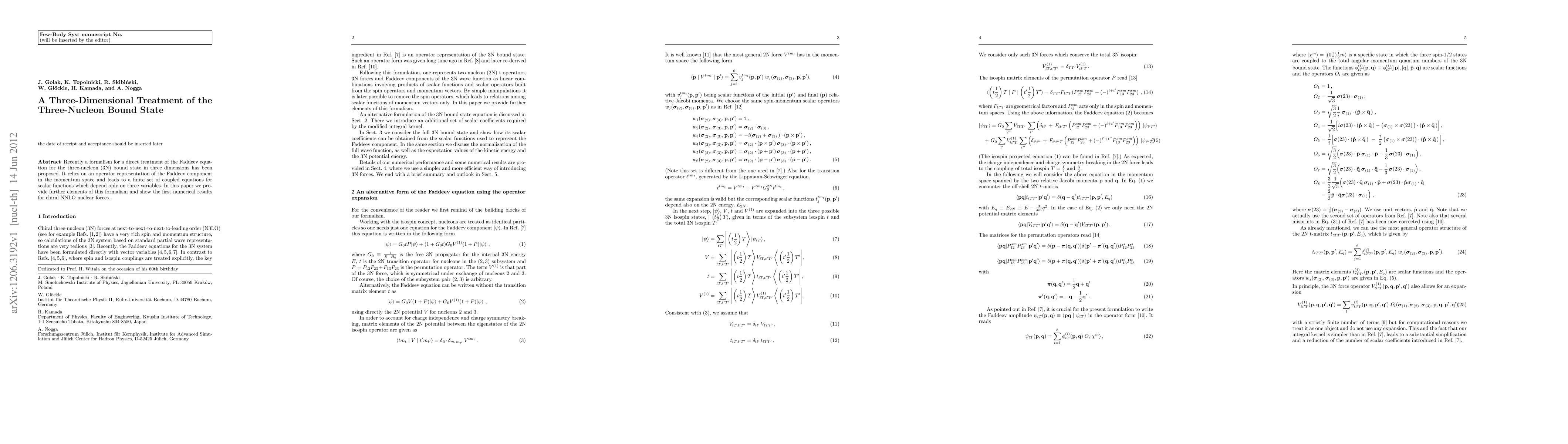 Recently a formalism for a direct treatment of the Faddeev equation for the three-nucleon bound state in three dimensions has been proposed. It relies on an operator representation of the Faddeev component in the momentum space and leads to a finite set of coupled equations for scalar functions which depend only on three variables. In this paper we provide further elements of this formalism and show the first numerical results for chiral NNLO nuclear forces.