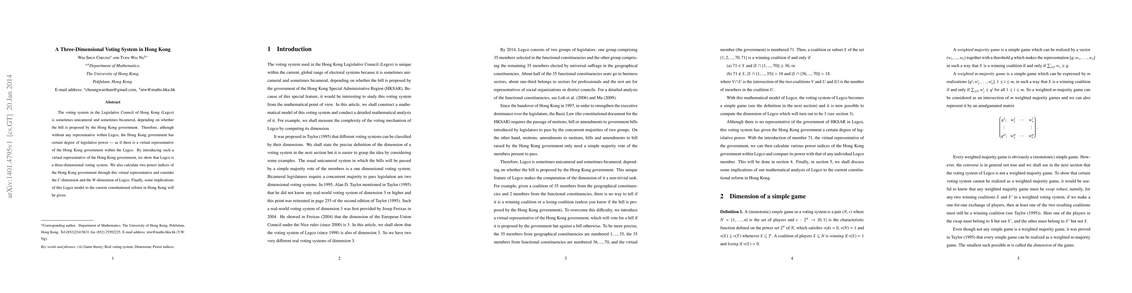 The voting system in the Legislative Council of Hong Kong (Legco) is sometimes unicameral and sometimes bicameral, depending on whether the bill is proposed by the Hong Kong government. Therefore, although without any representative within Legco, the Hong Kong government has certain degree of legislative power --- as if there is a virtual representative of the Hong Kong government within the Legco. By introducing such a virtual representative of the Hong Kong government, we show that Legco is a three-dimensional voting system. We also calculate two power indices of the Hong Kong government through this virtual representative and consider the $C$-dimension and the $W$-dimension of Legco. Finally, some implications of this Legco model to the current constitutional reform in Hong Kong will be given.