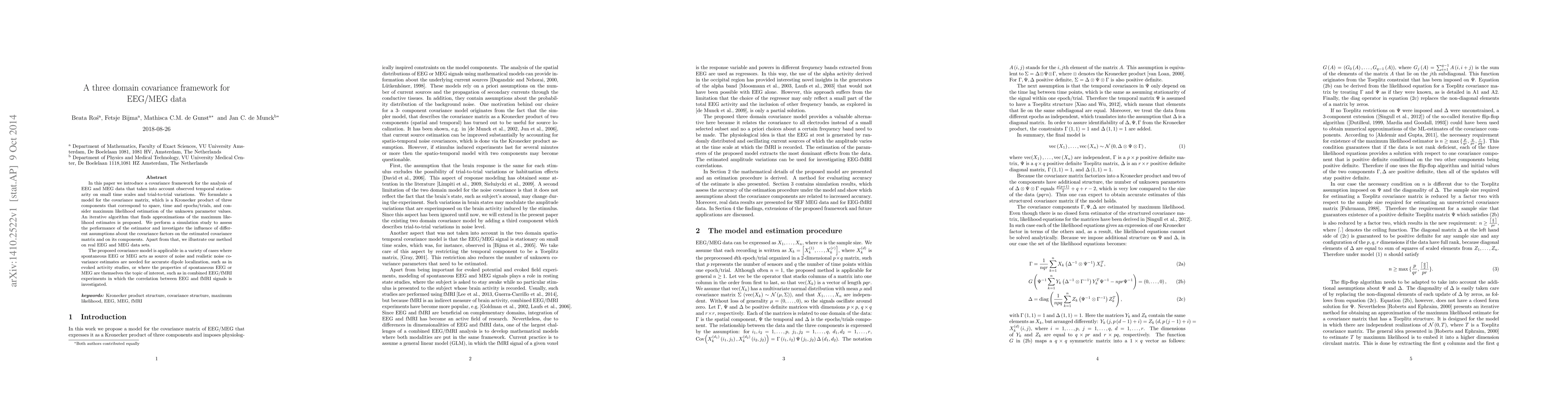 This paper proposes a three-domain covariance framework for EEG/MEG data analysis, accounting for temporal stationarity and trial-to-trial variations. The model uses a Kronecker product for space, time, and epochs, with a maximum likelihood estimation approach, and is validated through simulations and real data applications.