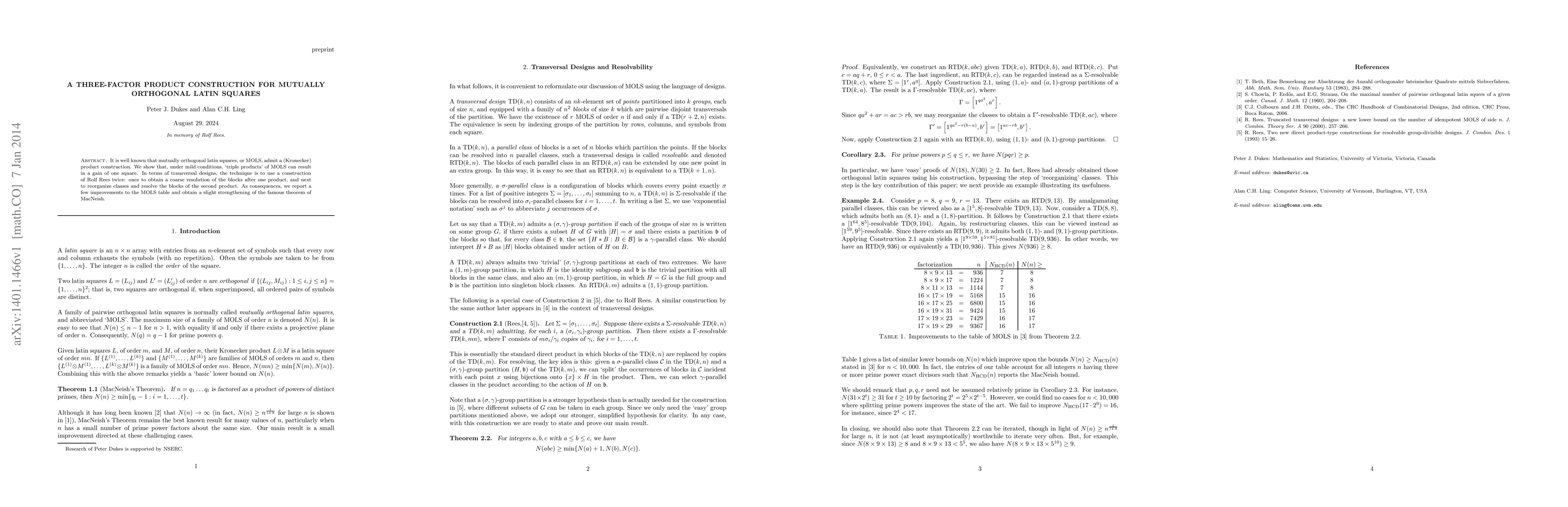 This paper presents a three-factor product construction for mutually orthogonal Latin squares (MOLS) that can yield an additional square under mild conditions. It employs Rolf Rees' construction twice to reorganize and resolve blocks, leading to improvements in MOLS tables and a slight strengthening of MacNeish's theorem.