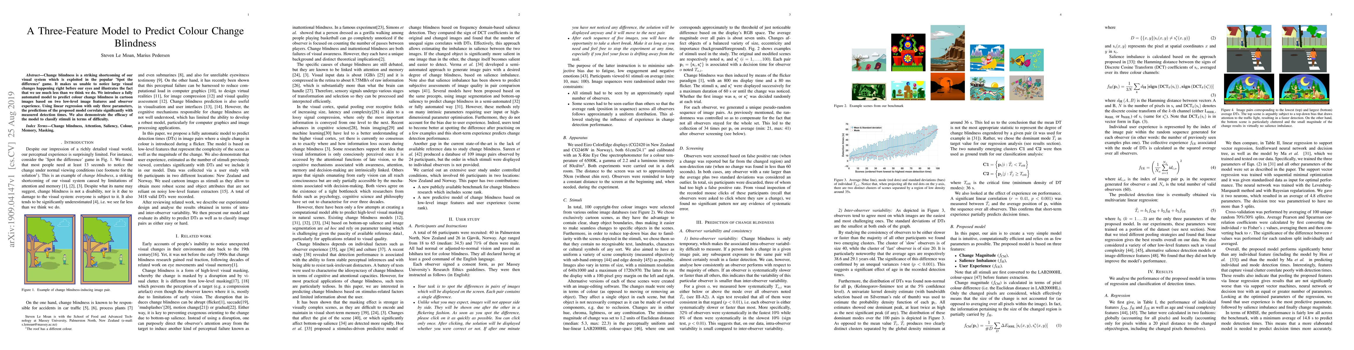 Change blindness is a striking shortcoming of our visual system which is exploited in the popular "Spot the difference" game. It makes us unable to notice large visual changes happening right before our eyes and illustrates the fact that we see much less than we think we do. We introduce a fully automated model to predict colour change blindness in cartoon images based on two low-level image features and observer experience. Using linear regression with only three parameters, the predictions of the proposed model correlate significantly with measured detection times. We also demonstrate the efficacy of the model to classify stimuli in terms of difficulty.
