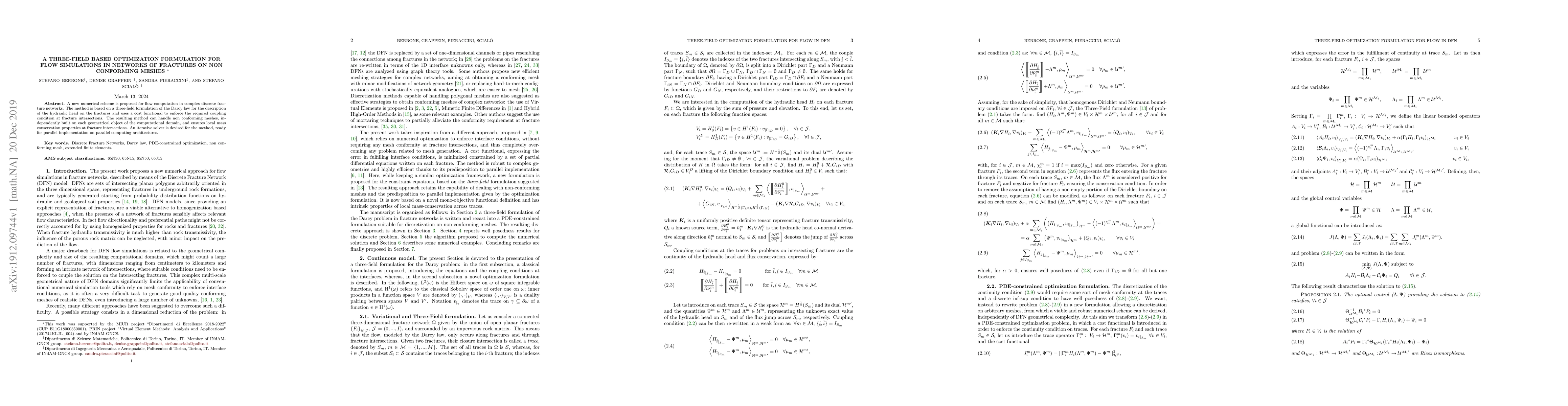 A new numerical scheme is proposed for flow computation in complex discrete fracture networks. The method is based on a three-field formulation of the Darcy law for the description of the hydraulic head on the fractures and uses a cost functional to enforce the required coupling condition at fracture intersections. The resulting method can handle non conforming meshes, independently built on each geometrical object of the computational domain, and ensures local mass conservation properties at fracture intersections. An iterative solver is devised for the method, ready for parallel implementation on parallel computing architectures.
