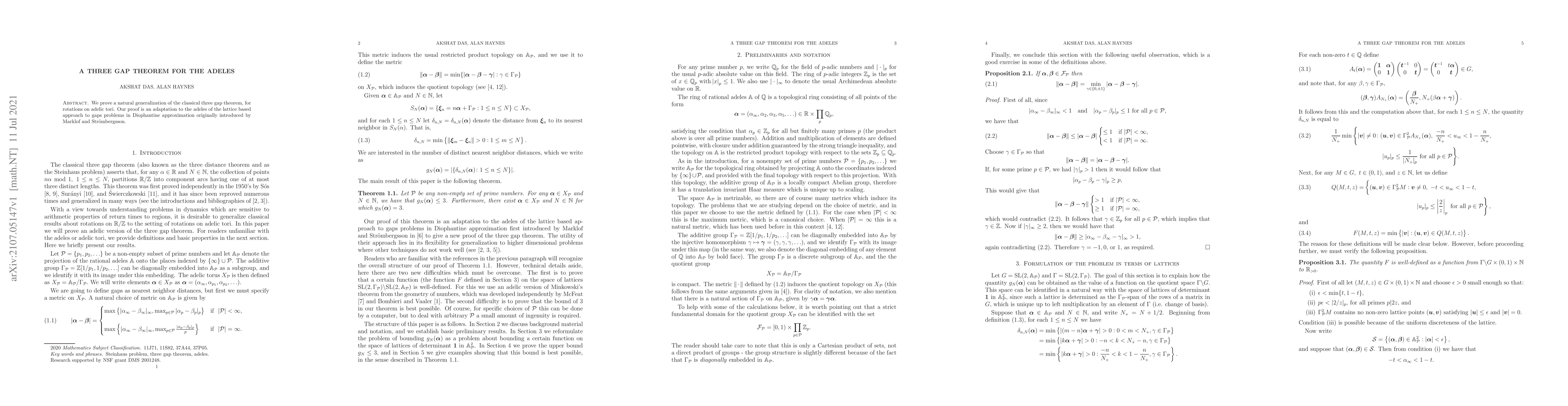 The paper proves a generalized three gap theorem for rotations on adelic tori, adapting a lattice-based approach to gaps problems in Diophantine approximation. This result generalizes the classical three gap theorem and has implications for understanding Diophantine approximation on adelic spaces.
