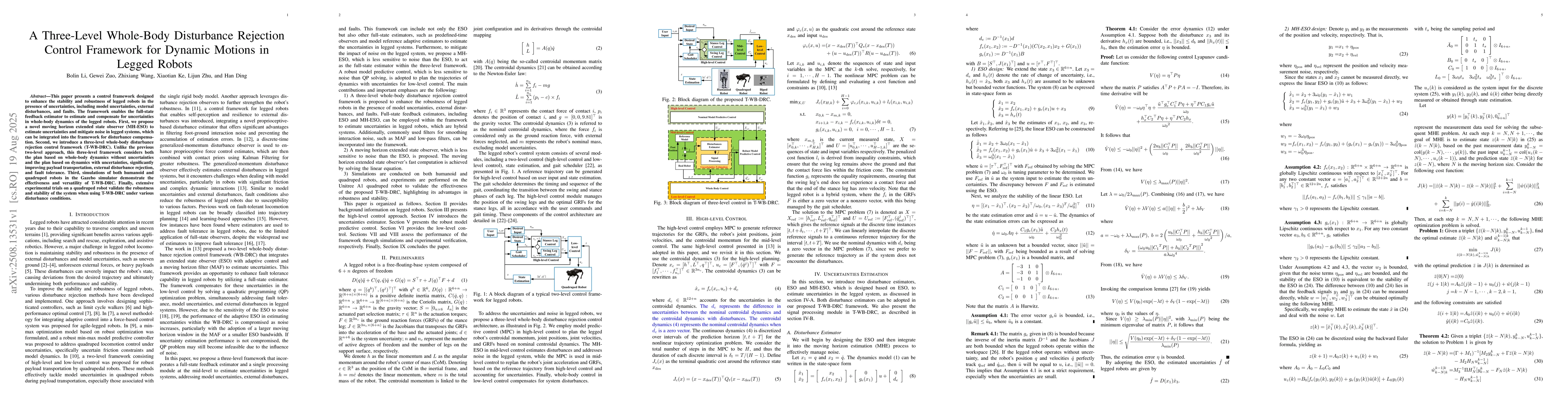 This paper presents a control framework designed to enhance the stability and robustness of legged robots in the presence of uncertainties, including model uncertainties, external disturbances, and faults. The framework enables the full-state feedback estimator to estimate and compensate for uncertainties in whole-body dynamics of the legged robots. First, we propose a novel moving horizon extended state observer (MH-ESO) to estimate uncertainties and mitigate noise in legged systems, which can be integrated into the framework for disturbance compensation. Second, we introduce a three-level whole-body disturbance rejection control framework (T-WB-DRC). Unlike the previous two-level approach, this three-level framework considers both the plan based on whole-body dynamics without uncertainties and the plan based on dynamics with uncertainties, significantly improving payload transportation, external disturbance rejection, and fault tolerance. Third, simulations of both humanoid and quadruped robots in the Gazebo simulator demonstrate the effectiveness and versatility of T-WB-DRC. Finally, extensive experimental trials on a quadruped robot validate the robustness and stability of the system when using T-WB-DRC under various disturbance conditions.