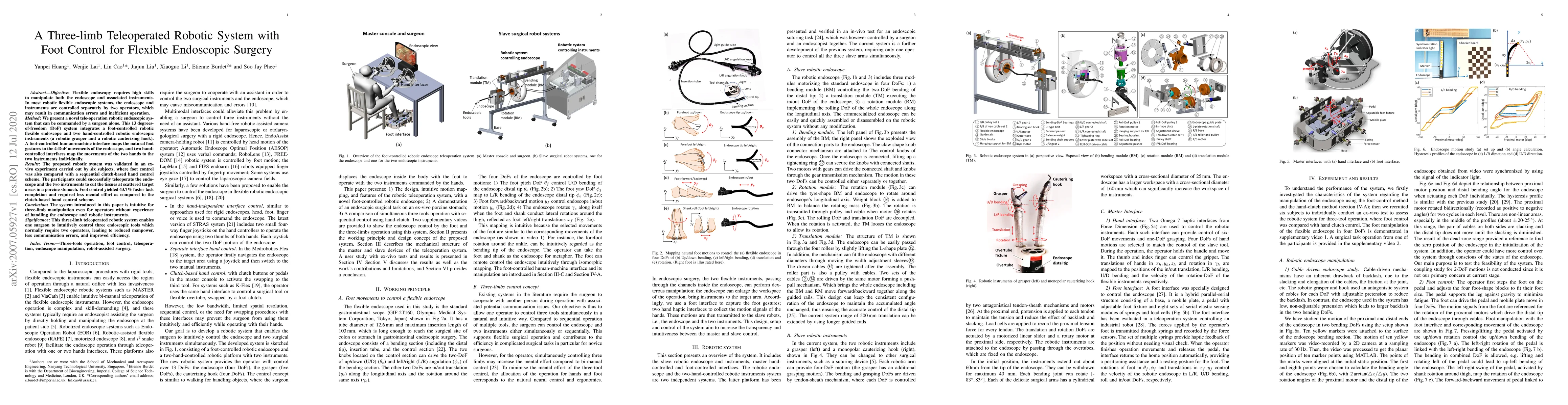 This paper introduces a novel 13 DoF teleoperated robotic system for flexible endoscopic surgery, allowing a single surgeon to control a foot-operated endoscope and two hand-operated instruments. Foot control was found to be 43.7% faster and less mentally demanding than traditional hand control, improving efficiency and reducing communication errors.
