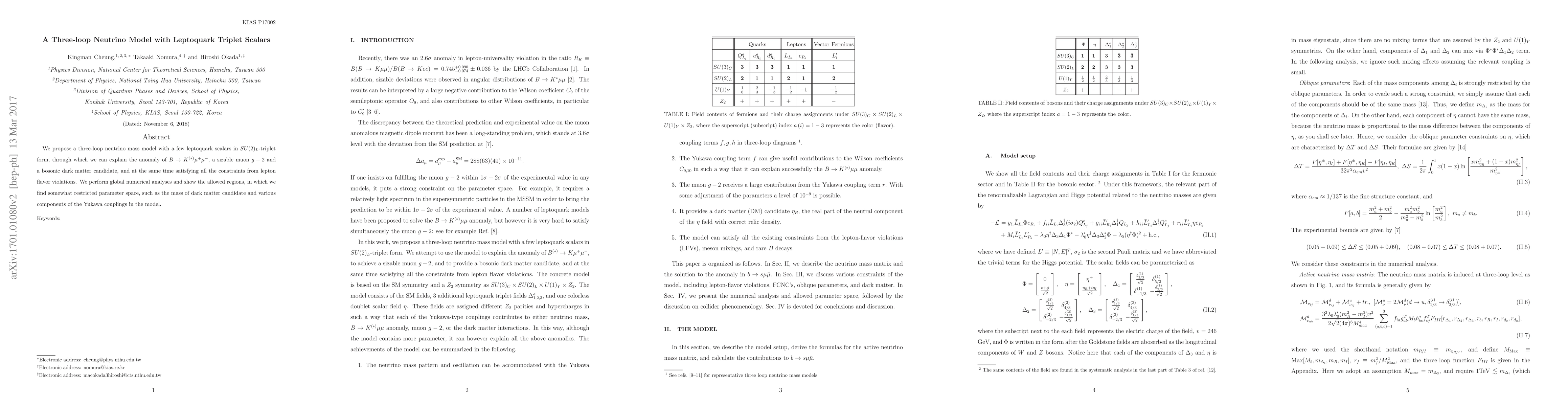 Development of a three-loop neutrino mass model with leptoquark triplet scalars, providing a framework to explain multiple experimental anomalies simultaneously.