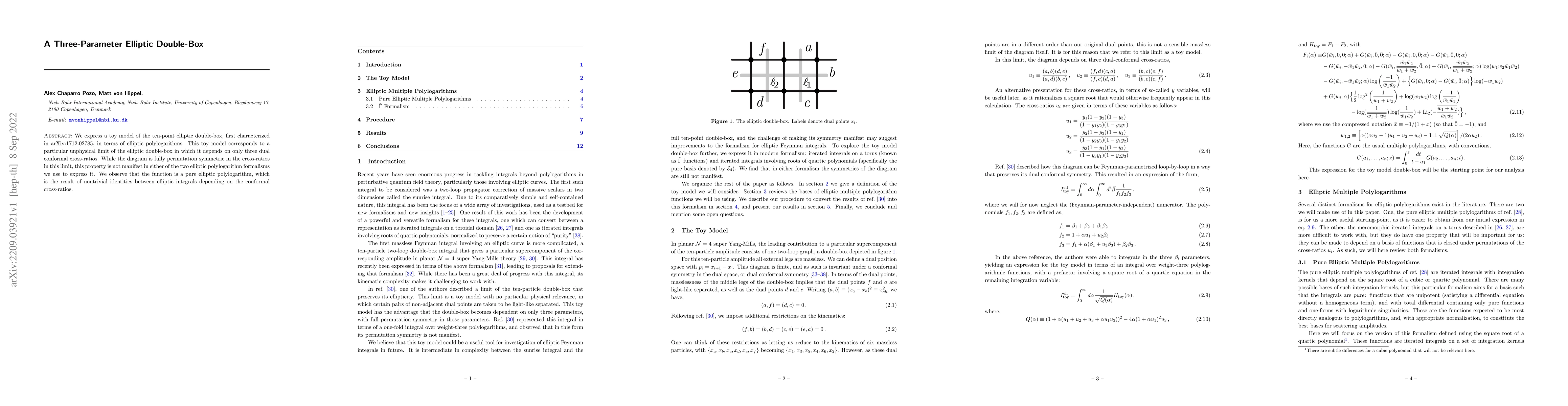 We express a toy model of the ten-point elliptic double-box, first characterized in arXiv:1712.02785, in terms of elliptic polylogarithms. This toy model corresponds to a particular unphysical limit of the elliptic double-box in which it depends on only three dual conformal cross-ratios. While the diagram is fully permutation symmetric in the cross-ratios in this limit, this property is not manifest in either of the two elliptic polylogarithm formalisms we use to express it. We observe that the function is a pure elliptic polylogarithm, which is the result of nontrivial identities between elliptic integrals depending on the conformal cross-ratios.