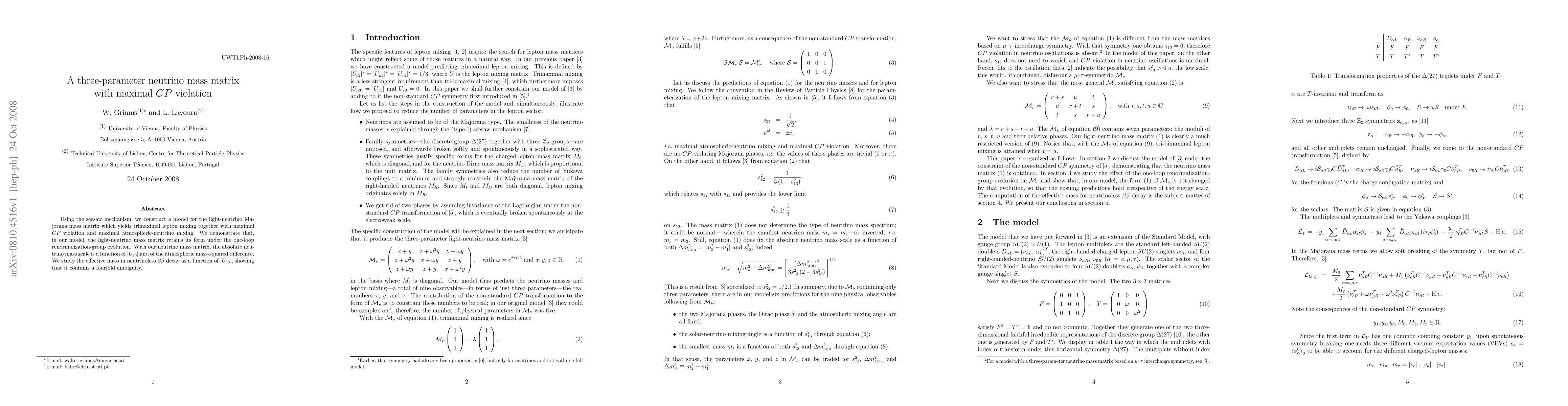 This paper constructs a three-parameter neutrino mass matrix using the seesaw mechanism, achieving trimaximal lepton mixing, maximal CP violation, and maximal atmospheric-neutrino mixing. The model maintains its form under renormalization-group evolution and links the absolute neutrino mass scale to |U_e3| and the atmospheric mass-squared difference.