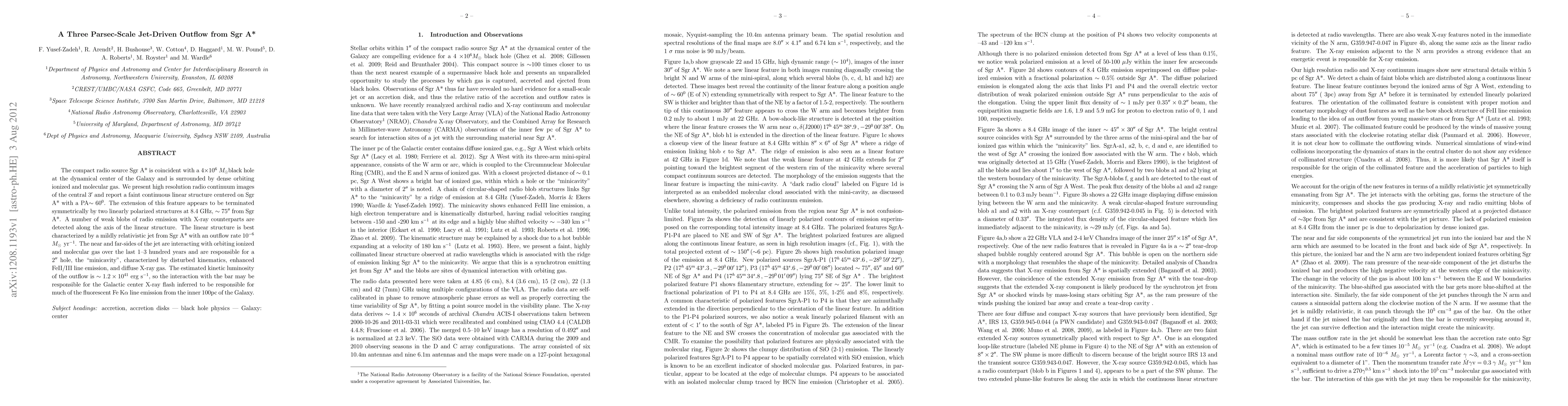 The compact radio source Sgr A* is coincident with a 4 million solar mass black hole at the dynamical center of the Galaxy and is surrounded by dense orbiting ionized and molecular gas. We present high resolution radio continuum images of the central 3' and report a faint continuous linear structure centered on Sgr A* with a PA~60 degrees. The extension of this feature appears to be terminated symmetrically by two linearly polarized structures at 8.4 GHz, ~75" from Sgr A*. A number of weak blobs of radio emission with X-ray counterparts are detected along the axis of the linear structure. The linear structure is best characterized by a mildly relativistic jet from Sgr A* with an outflow rate 10^-6 solar mass per year. The near and far-sides of the jet are interacting with orbiting ionized and molecular gas over the last 1-3 hundred years and are responsible for a 2" hole, the "minicavity", characterized by disturbed kinematics, enhanced FeII/III line emission, and diffuse X-ray gas. The estimated kinetic luminosity of the outflow is ~1.2x10^{41} erg/s, so the interaction with the bar may be responsible for the Galactic center X-ray flash inferred to be responsible for much of the fluorescent Fe Kalpha line emission from the inner 100pc of the Galaxy.