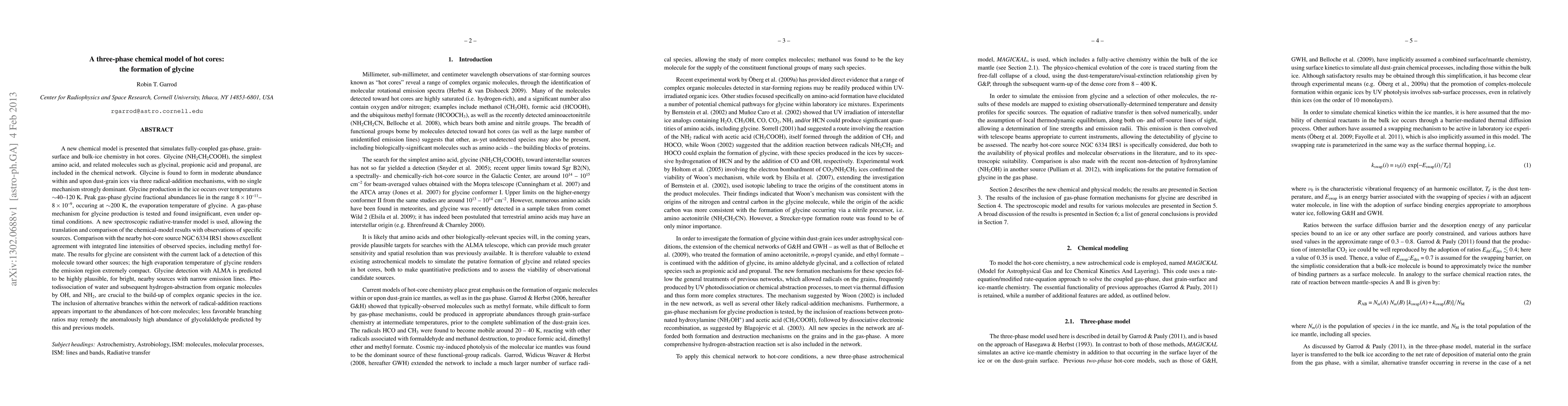 This paper presents a comprehensive chemical model simulating gas-phase, grain-surface, and bulk-ice chemistry in hot cores, finding glycine forms via three radical-addition mechanisms in dust-grain ices at temperatures 40-120 K. The model predicts glycine's gas-phase abundance and suggests ALMA could detect it in bright, nearby sources.