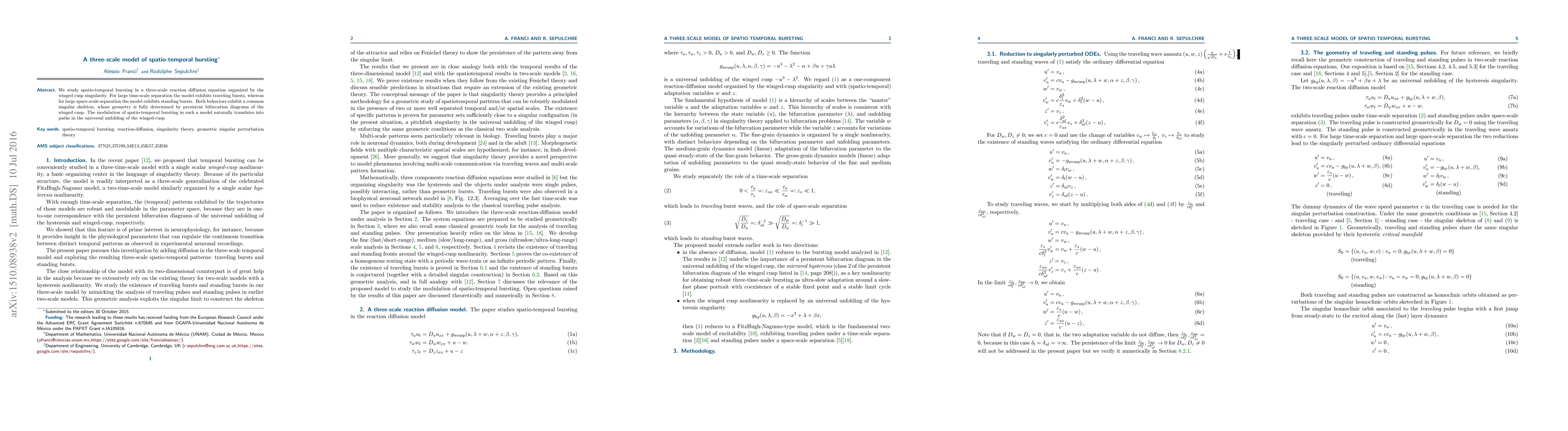 We study spatio-temporal bursting in a three-scale reaction diffusion equation organized by the winged cusp singularity. For large time-scale separation the model exhibits traveling bursts, whereas for large space-scale separation the model exhibits standing bursts. Both behaviors exhibit a common singular skeleton, whose geometry is fully determined by persistent bifurcation diagrams of the winged cusp. The modulation of spatio-temporal bursting in such a model naturally translates into paths in the universal unfolding of the winged-cusp.