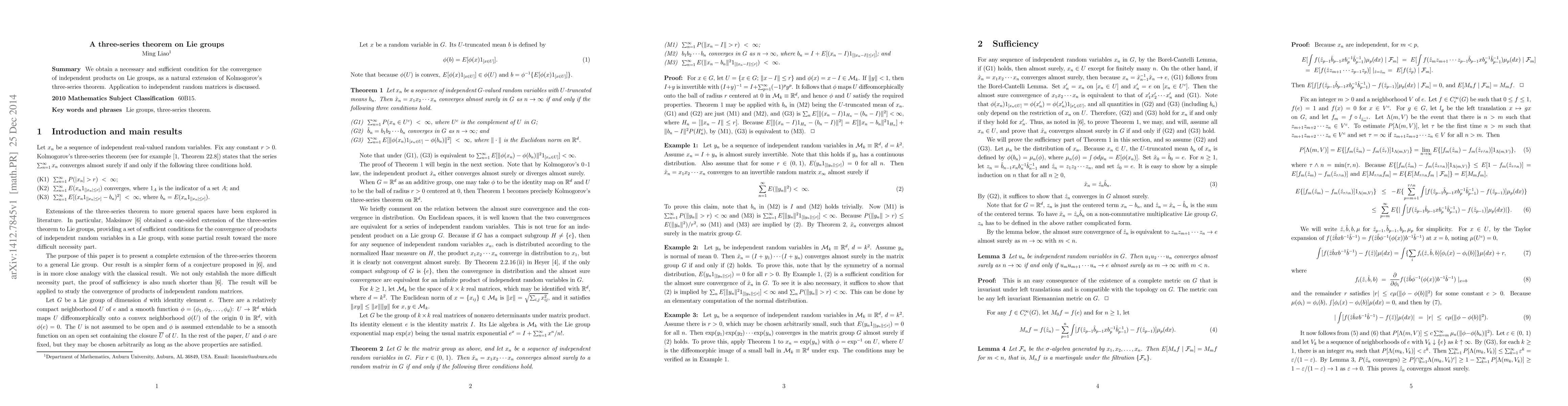 Summary: The paper establishes a necessary and sufficient condition for the convergence of independent products on Lie groups, extending Kolmogorov's three-series theorem, with implications for the convergence of independent random matrices.
