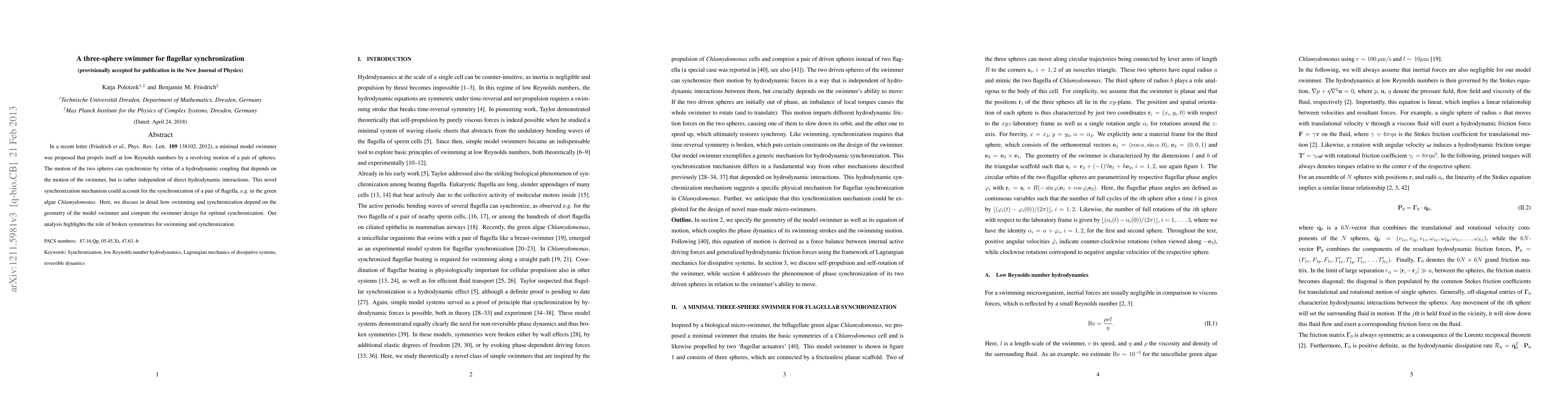 This paper explores a minimal model swimmer composed of two revolving spheres that can synchronize their motion through hydrodynamic coupling, potentially explaining flagellar synchronization in organisms like Chlamydomonas. The study investigates how swimmer geometry influences both swimming and synchronization, identifying broken symmetries as crucial for optimal synchronization.