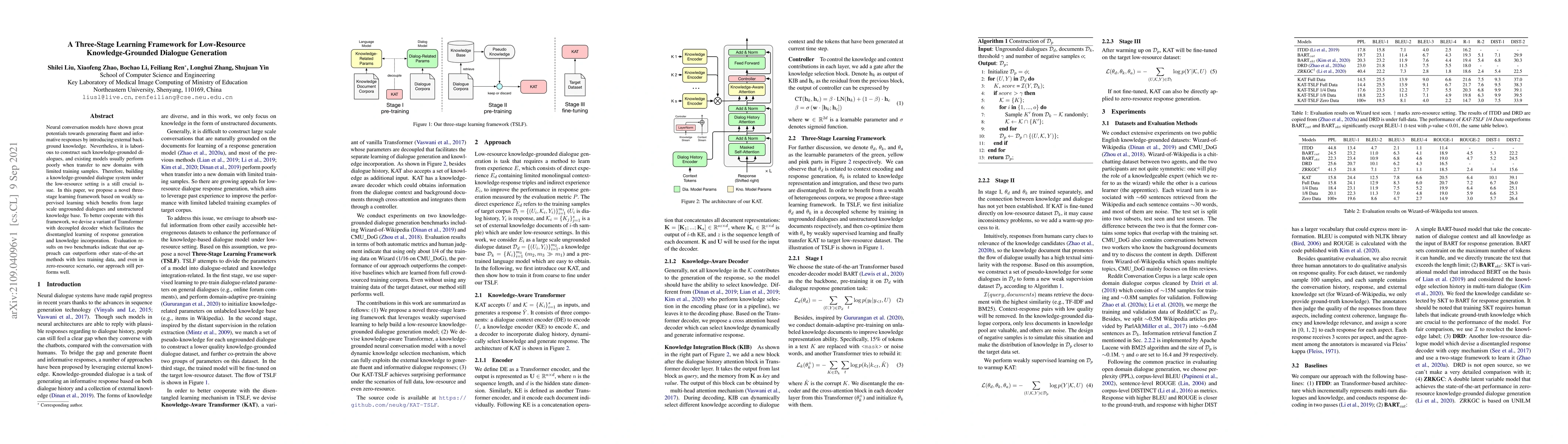 This paper proposes a three-stage learning framework for generating knowledge-grounded dialogues in low-resource settings. It utilizes weakly supervised learning and a decoupled Transformer variant to efficiently incorporate large-scale, ungrounded dialogues and unstructured knowledge bases, achieving better performance than other methods even with minimal training data.