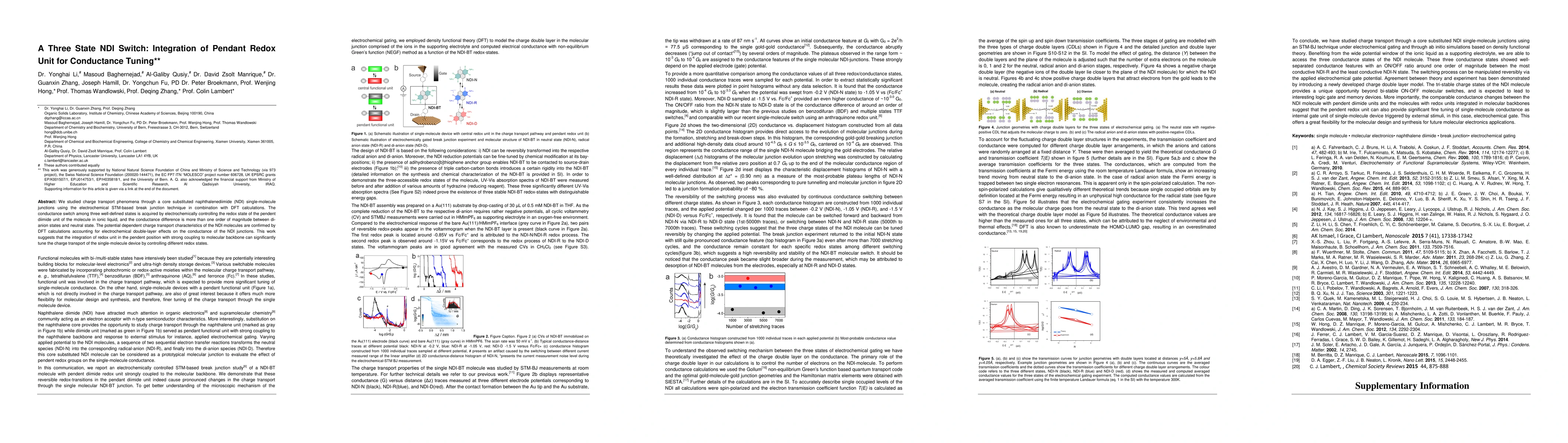 This paper investigates charge transport in single-molecule junctions using core-substituted naphthalenediimide (NDI) with electrochemical STM-based break junctions and DFT calculations. The study demonstrates a three-state conductance switch by electrochemically controlling the redox state of a pendant diimide unit, showing over an order of magnitude difference in conductance between di-anion and neutral states.