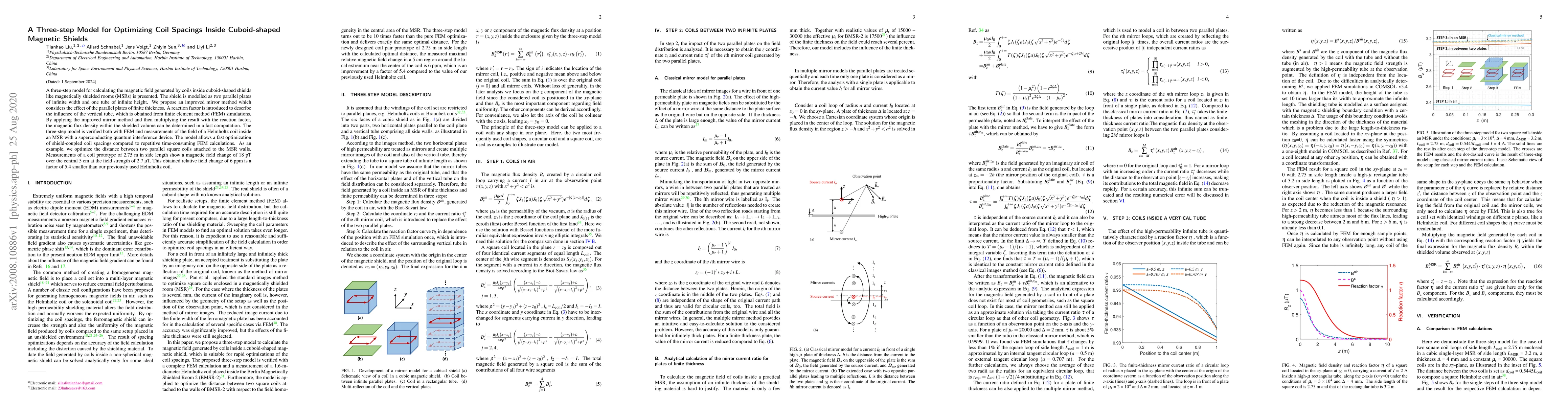A three-step model for calculating the magnetic field generated by coils inside cuboid-shaped shields like magnetically shielded rooms (MSRs) is presented. The shield is modelled as two parallel plates of infinite width and one tube of infinite height. We propose an improved mirror method which considers the effect of the parallel plates of finite thickness. A reaction factor is introduced to describe the influence of the vertical tube, which is obtained from finite element method (FEM) simulations. By applying the improved mirror method and then multiplying the result with the reaction factor, the magnetic flux density within the shielded volume can be determined in a fast computation. The three-step model is verified both with FEM and measurements of the field of a Helmholtz coil inside an MSR with a superconducting quantum interference device. The model allows a fast optimization of shield-coupled coil spacings compared to repetitive time-consuming FEM calculations. As an example, we optimize the distance between two parallel square coils attached to the MSR walls. Measurements of a coil prototype of 2.75~m in side length show a magnetic field change of 18~pT over the central 5~cm at the field strength of 2.7~\textmu T. This obtained relative field change of 6~ppm is a factor of 5.4 smaller than our previously used Helmholtz coil.